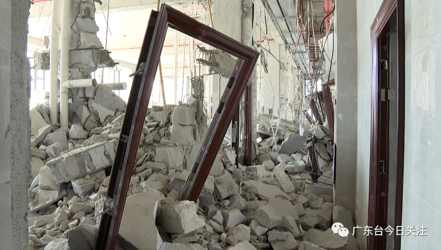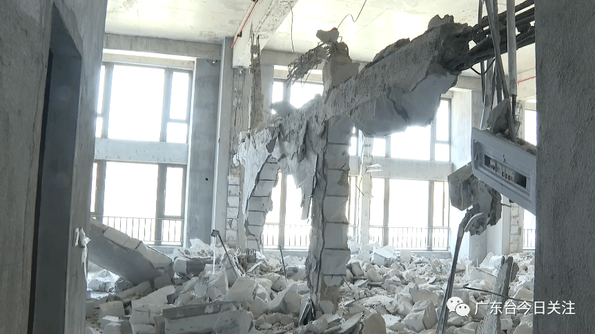 记者来到肇庆四会市吾悦广场悦公馆2栋公寓,在二楼位置看到,现场真的可以用“满目疮痍”来形容,多面墙体被打掉,多条柱子被截断,裸露出钢筋。