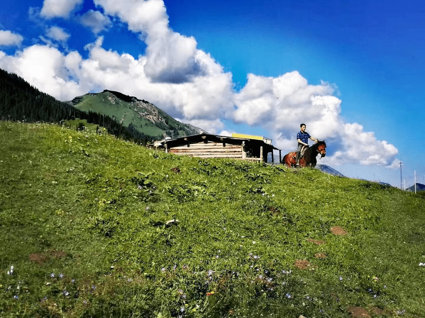 沿巩乃斯河一路往东,开始爬山。山势比较和缓,路况还不错。快到山顶时,远远地看到一个牧民在山上放羊,从山下望上去,蓝天白云之下,成了一幅优美的剪影。