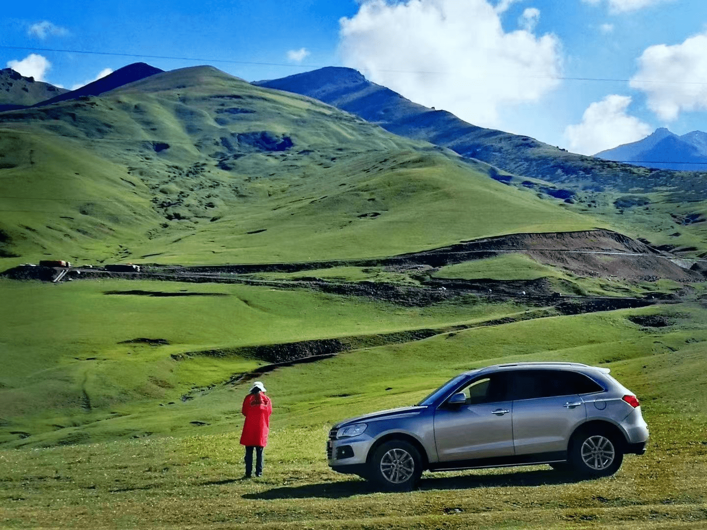 翻过山顶之后,是一望无际的高山草甸。公路两旁,不时有牧民在牧羊,羊群在连绵起伏的草地上飘移;天空是那种湛蓝,满是清澈,头顶一团团的白云,洁白如雪,就飘在你的眼前,低到似乎用手就可以够得着。
