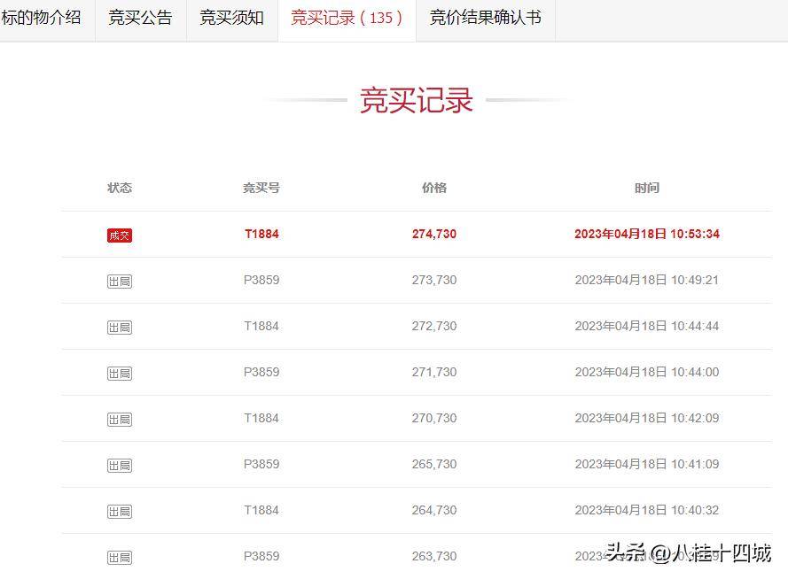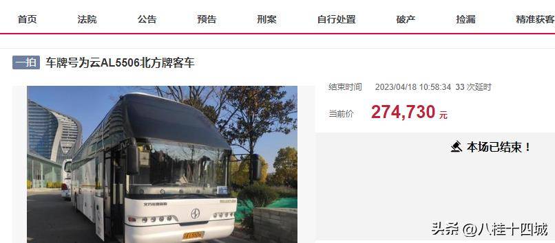 其中,最具竞争力的客车是2017年采购的北方品牌,50座客车,行驶里程318948公里,起步价51730元。共有30人报名参加拍卖。经过135轮涨价,拍卖结束。最终以27.473万元的高价成交。成交价较初始价高出22.3万元,溢价率为431%。
