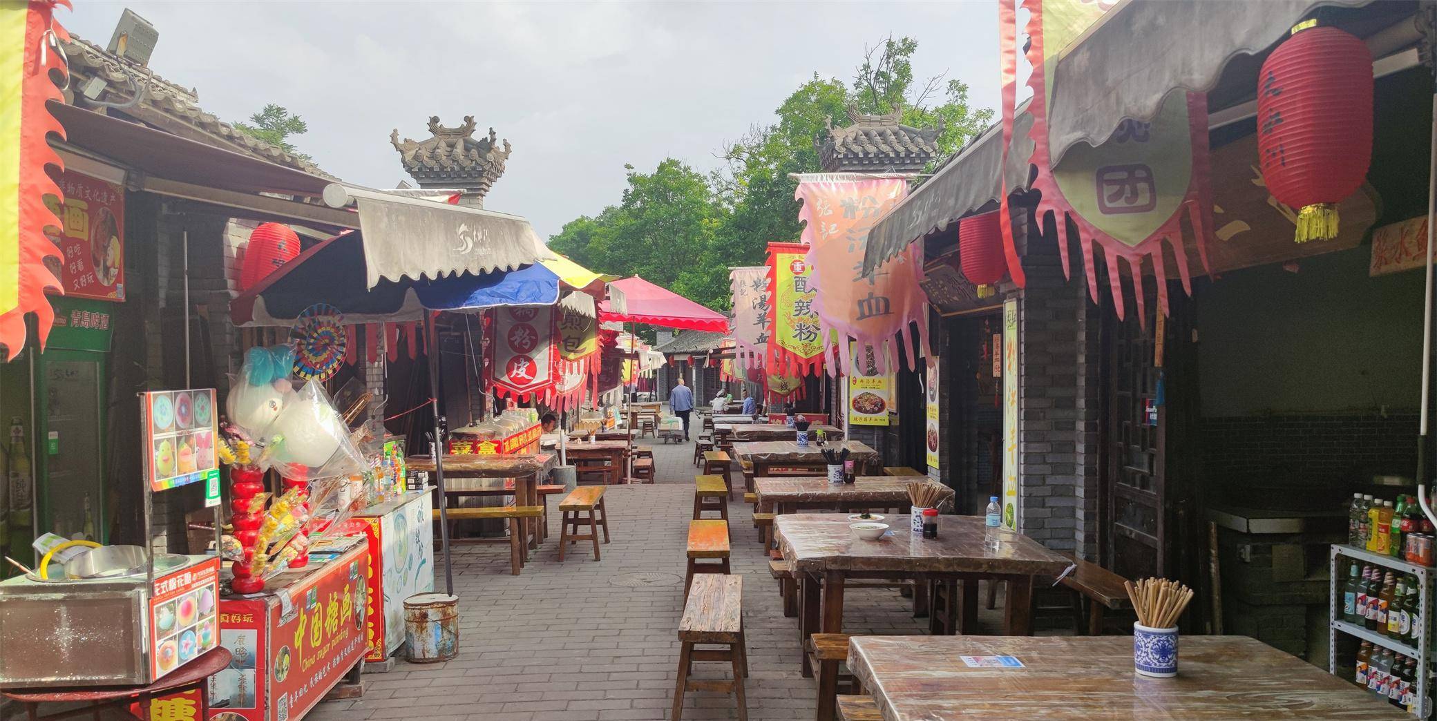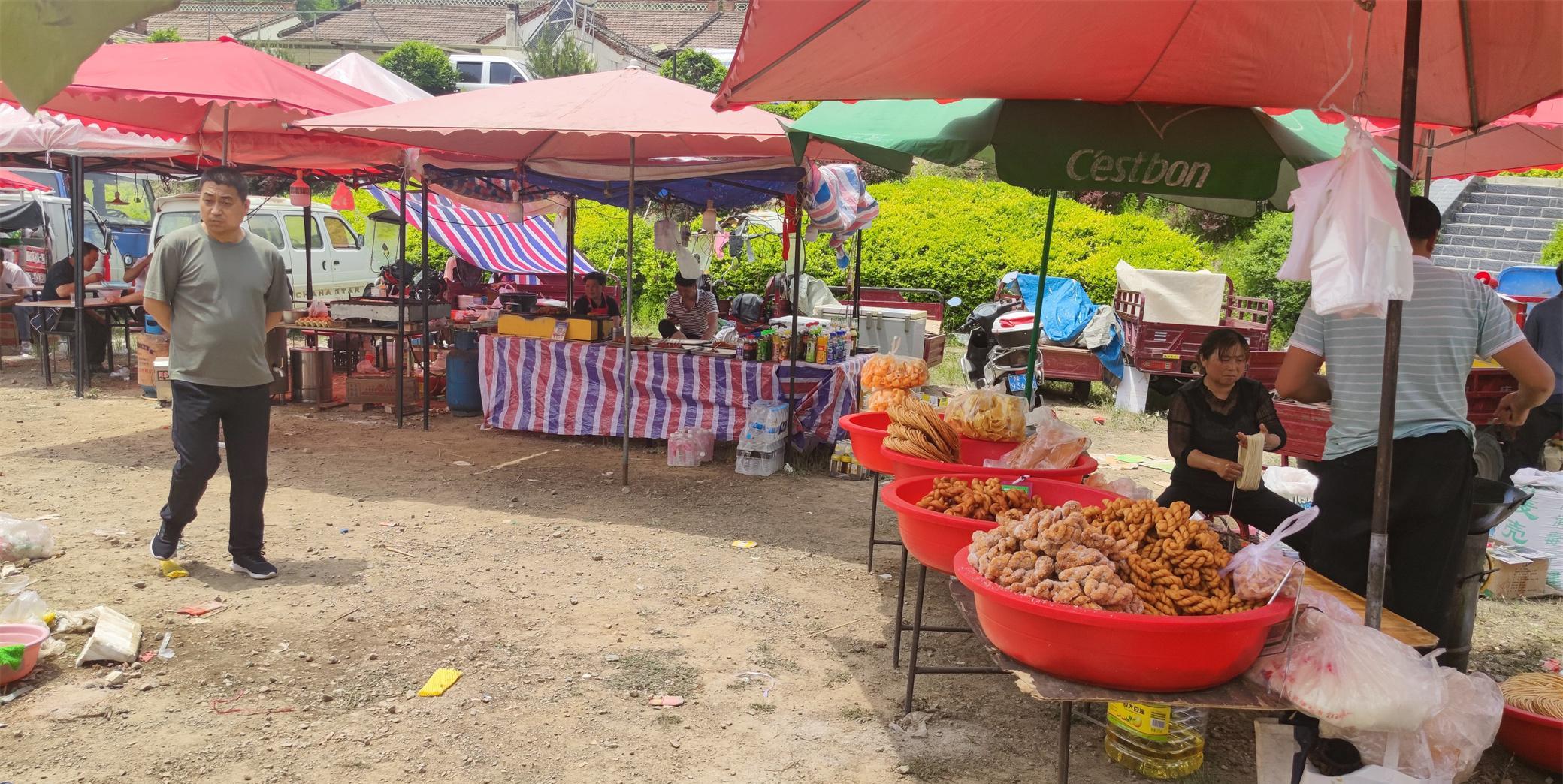 怀着好奇,一路走过去,发现原来并非帐篷,而是遮阳伞。伞下全是卖各色小吃的,有油条、油糕、各色面食、包馍、烤肠。原来这里在举办庙会。