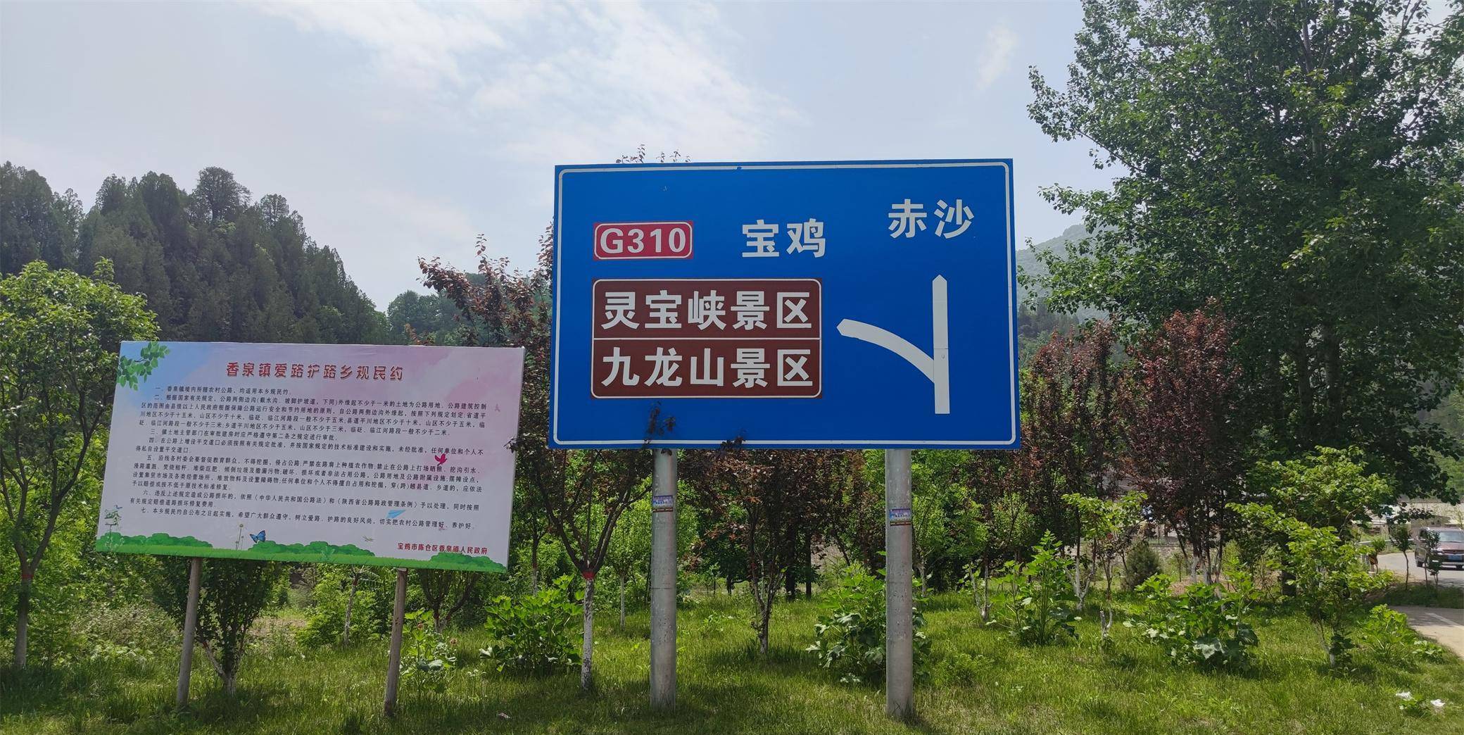 各河口是一个丁字路口,有一个路牌。此处天高云淡,绿树成荫。原本在宝鸡市区能把人热死,但到了这山区,突然感觉凉快了好多。