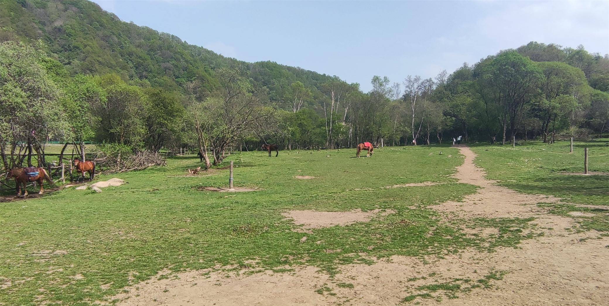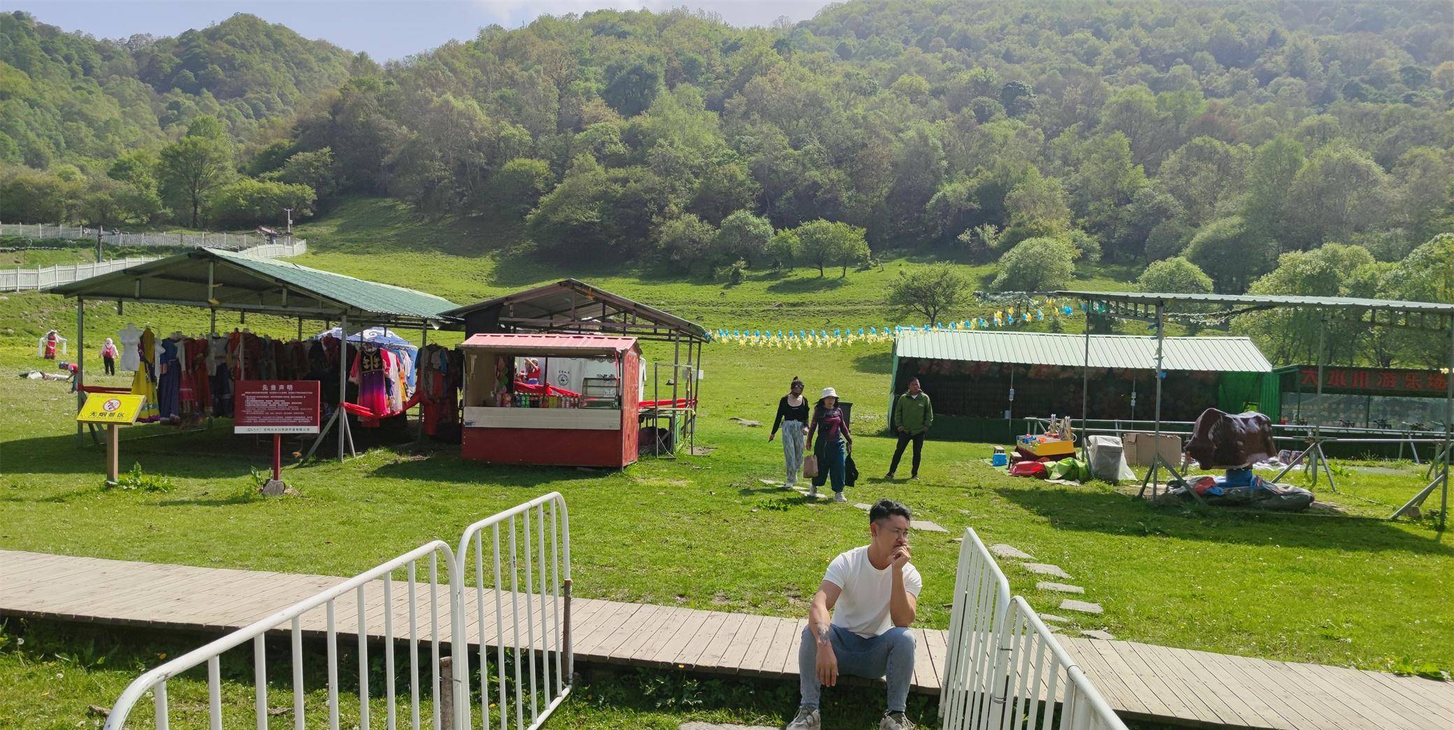 下了大巴,换上了电瓶观光车,继续沿着一条路前行着。两边皆是碧绿的草地,不时可以看到帐篷和骑马的人。草原上也有一条河,向着山的另一面流淌着,沿河有一条木制的走廊,一直延伸向下游。