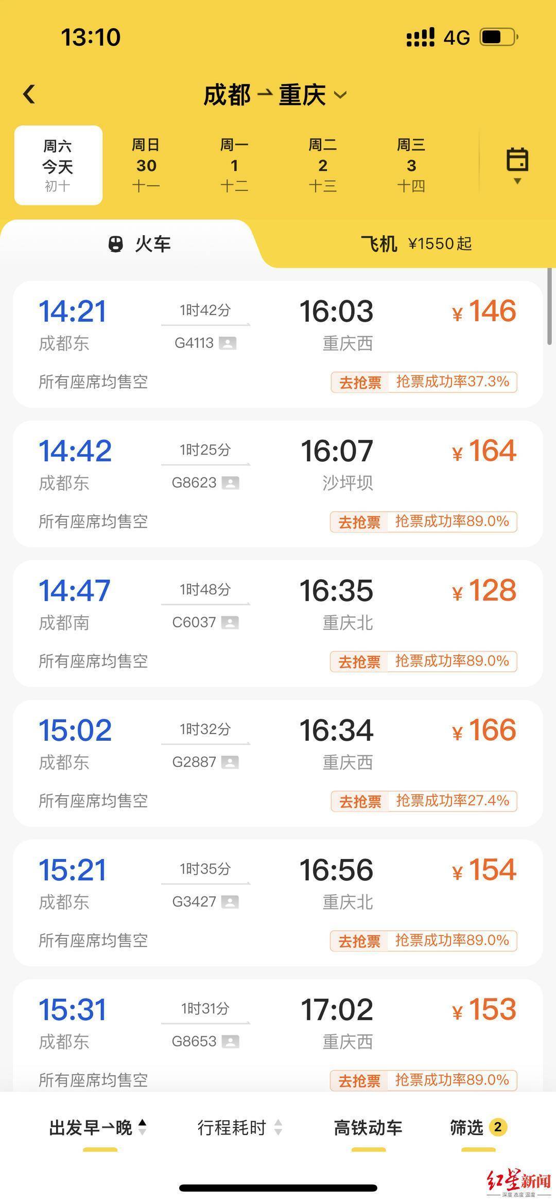 4月29日,红星新闻记者发现,“成都-重庆”、“成都-乐山”和“成都-西安”的高铁车票首日即告售罄。长假首日,“成都-重庆”、“深圳-广州”、“北京-天津”等短途航线热度持续走高。