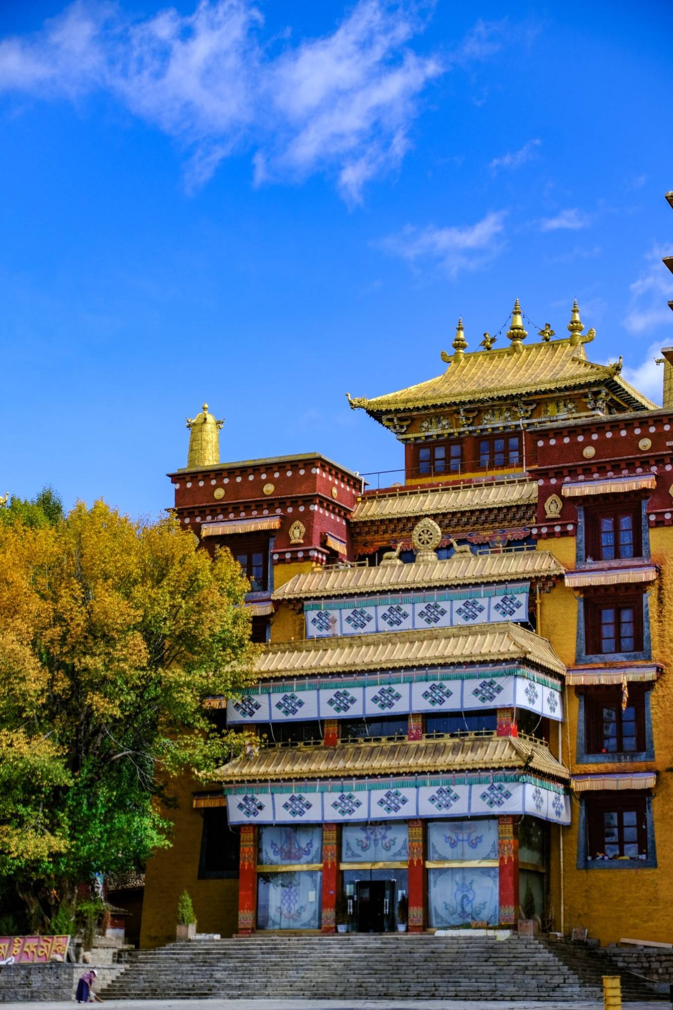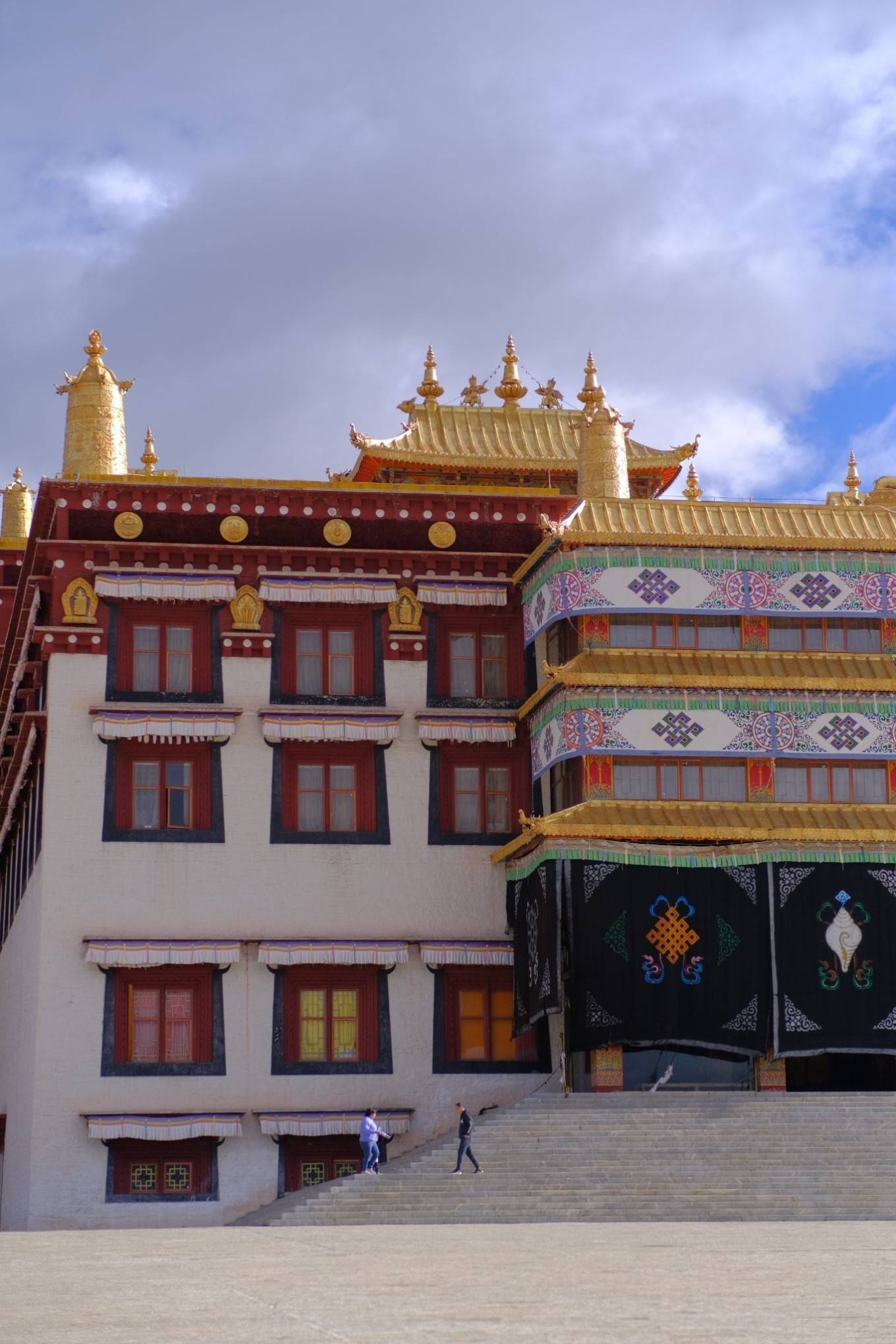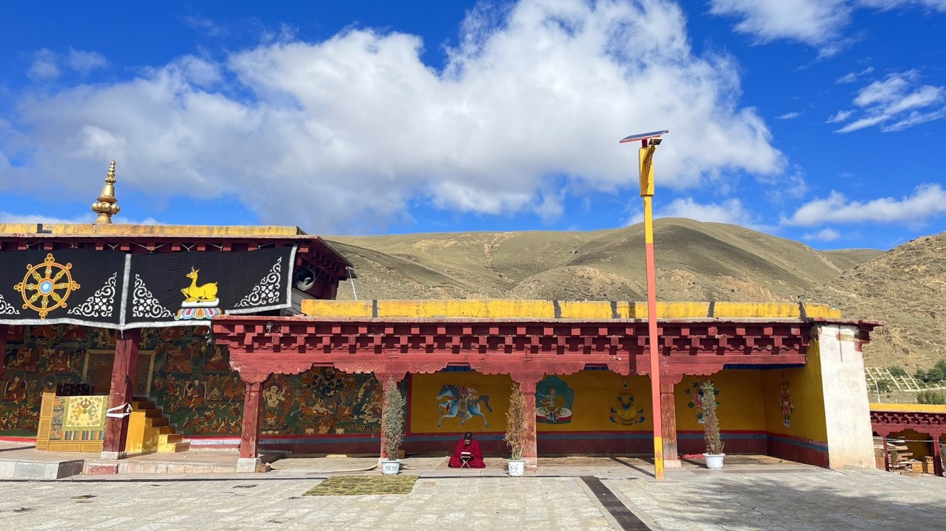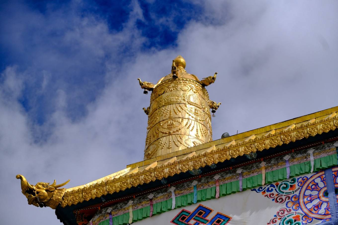 第一眼看长青春科尔寺 并没有想象中的古老 应该是后期翻修过的 其实来之前也并没有抱太多的期待 但是当我走进无人的佛殿内 目之所及 满墙满顶全部铺满了流光溢彩的手绘唐卡 无一处空白 殿堂之中是一尊近20米高的金身佛陀 周边的法器更是琳琅满目 殿内的光线忽明忽暗 仿佛听见了神明在低语