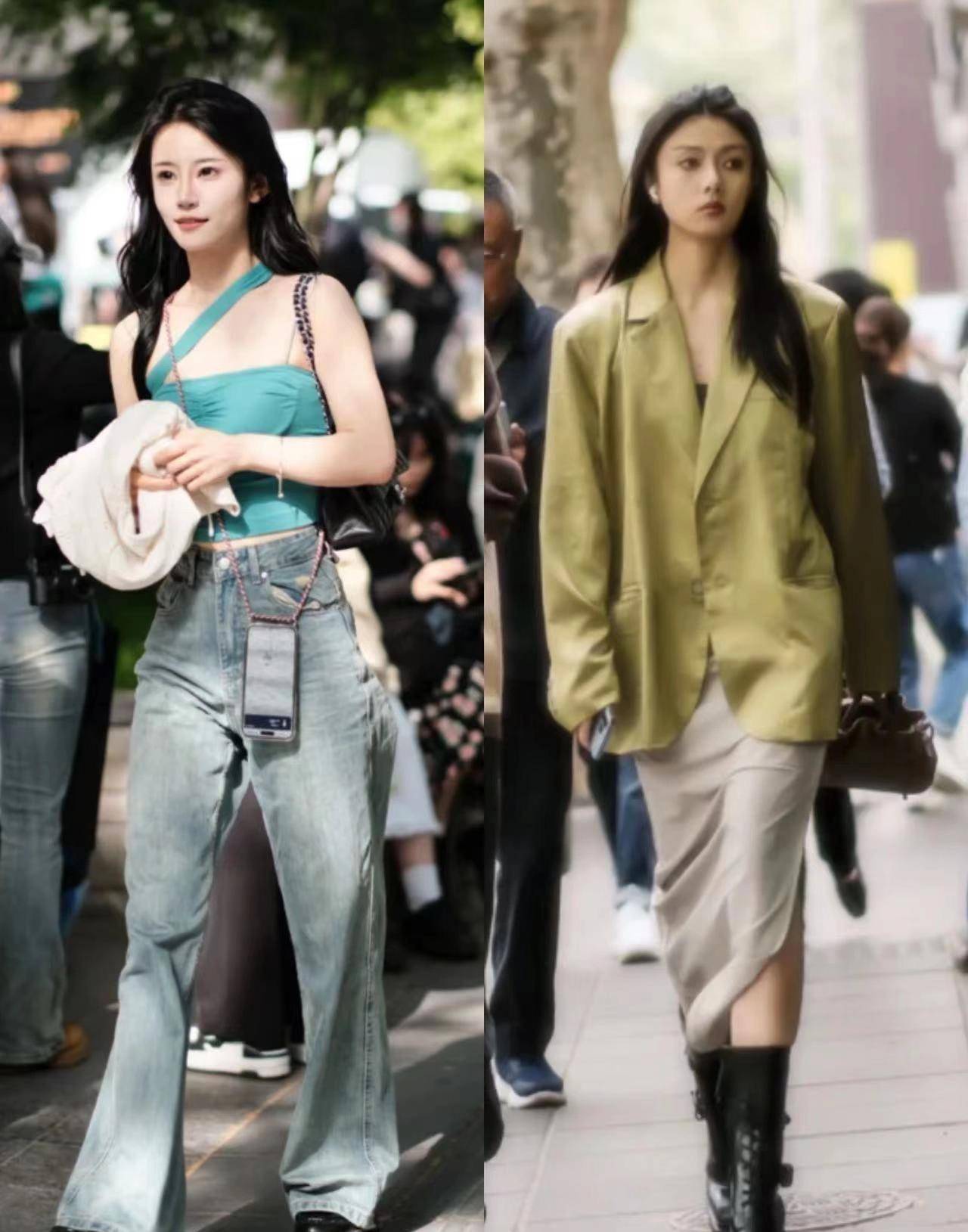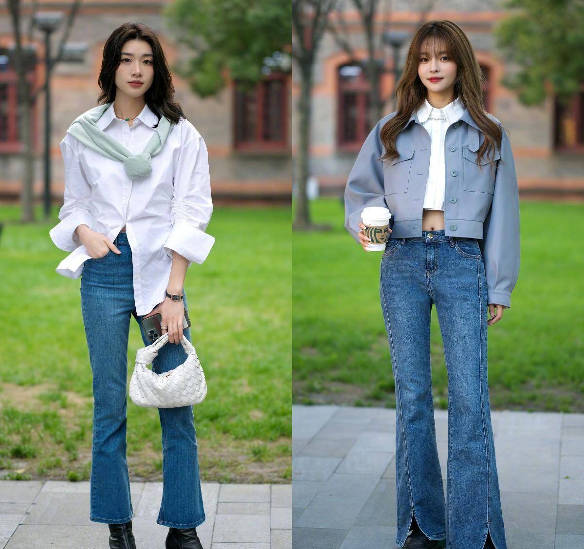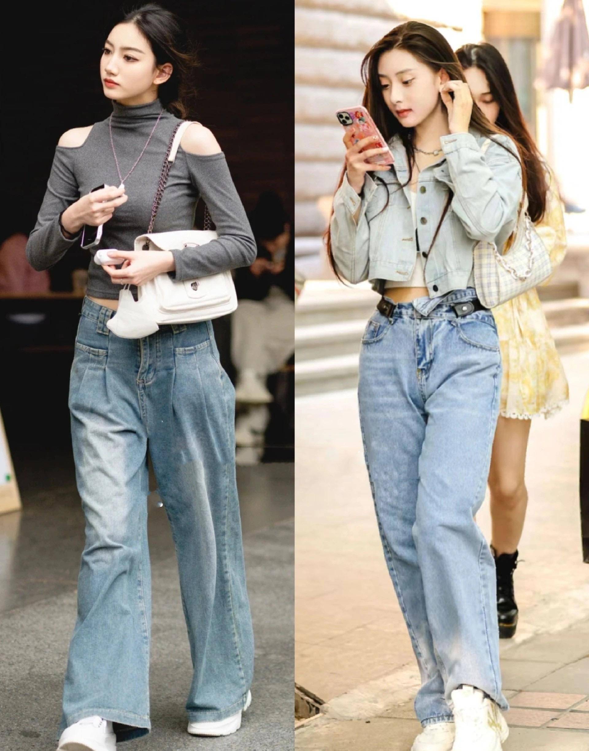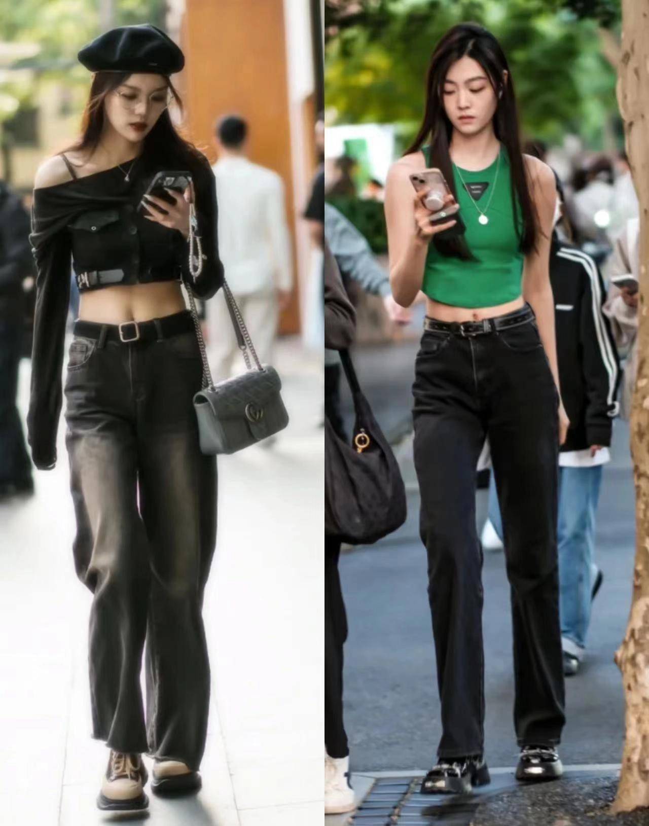 或者你也可以像下面这两位素人小姐姐一样,用露肩灰色上衣搭配牛仔裤或者短款牛仔外套搭配直筒裤,秀出你的小蛮腰优势,既吸睛又吸睛抢了风头。