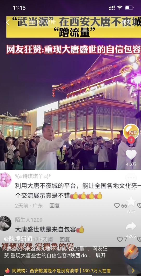 ▲截图来源为《陕西新闻》抖音几位网友表示,大唐的盛世源于包容,西安的情况已经不复存在了。它不仅在发展,而且在全国带动文化旅游。利用大唐不夜城这个平台来分享和展示全国各地的文化,非常好。