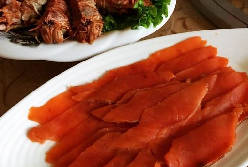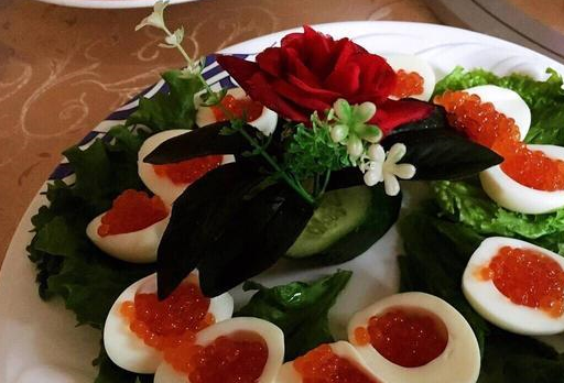 我也没问多少就去了,来看看我们吃的是什么菜吧,我们总共去了10个人,上了一桌子的海鲜。图一中的是鸡蛋鱼子酱,这鱼子酱也是俄罗斯的经典美食之一。第二个盘子里的是生鱼片,味道也是很不错的。