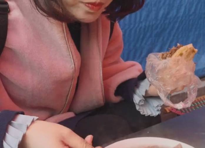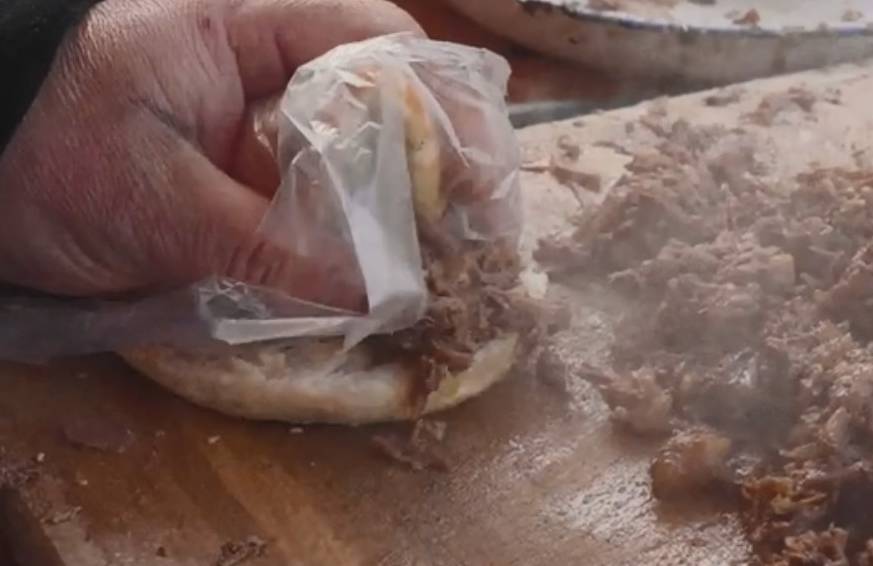 只见大叔把牛肉捞起来放到案板上,用刀轻轻一剁就烂了,再淋上一点汤汁,夹到馍馍里面,这个牛肉夹馍就完成了。看这个8块钱的牛肉夹馍,份量确实是很实在的,中间的牛肉有两三公分厚,一口咬下全是牛肉,而且牛肉多到都挤出来了,还带有一些汤汁,吃起来真是太过瘾了,馍馍更是烤到酥香可口。