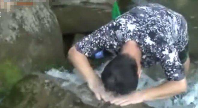 大爷似乎也察觉到了这点,便邀请摄制组里一名年轻的小伙来试试这条溪水的神奇之处,