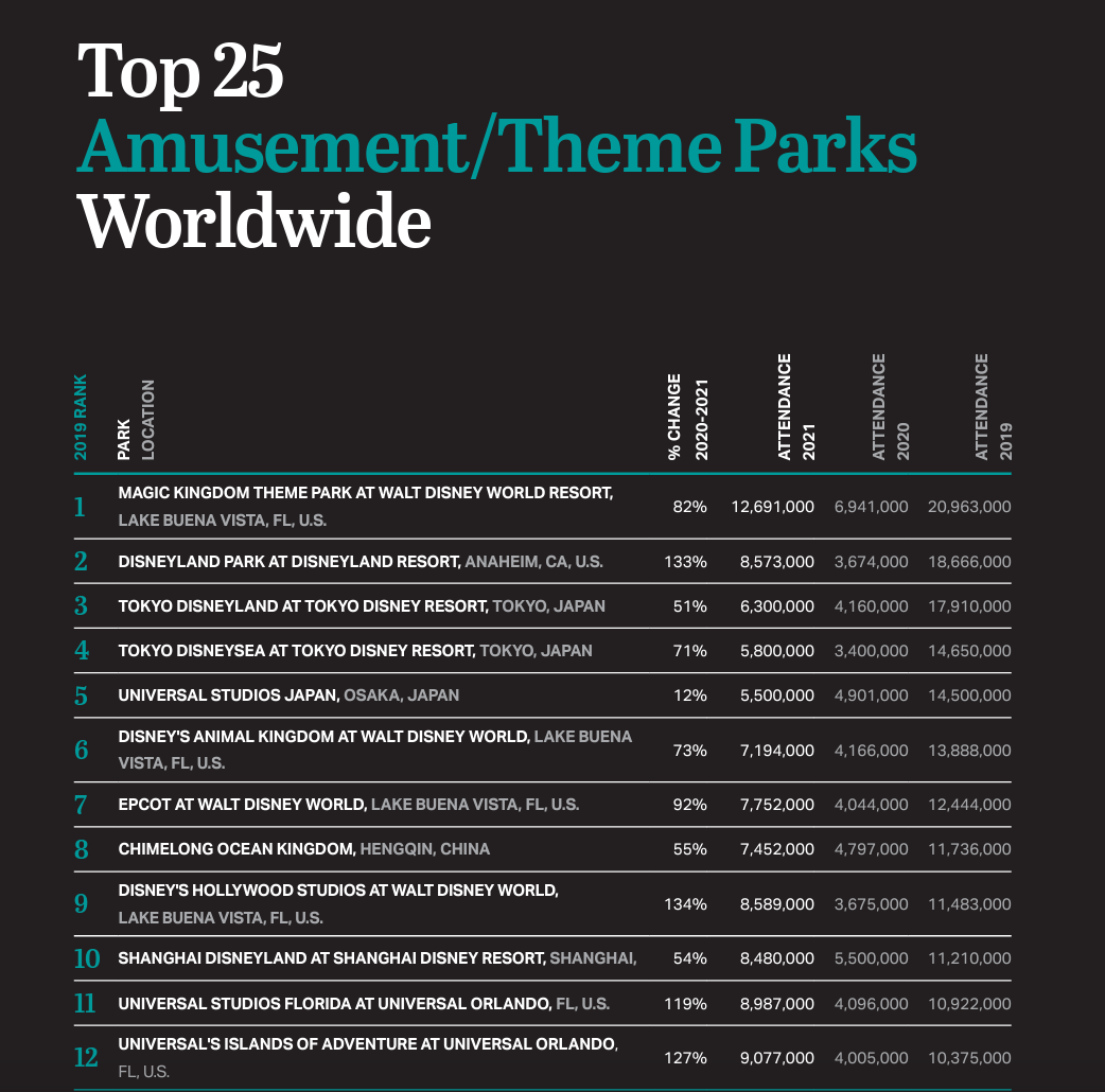 国际主题娱乐协会TEA(Themed Entertainment Association)联合基础设施咨询公司AECOM发布的最新报告——《2021全球主题公园和博物馆报告》(2021Theme Index and Museum Index)显示,2021年全球排名前25位的主题公园中,前10位中除了排名第5的日本环球影城和排名第8的长隆海洋王国,另外8座都是“迪士尼出品”。