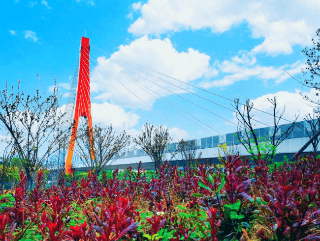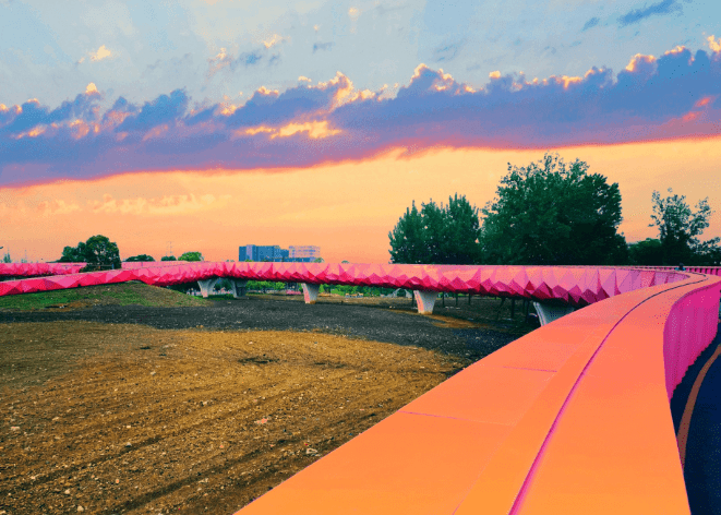 这是一座少女心爆棚的粉红桥,桥的护栏外立面像是用钻石切割法打造而成的奇砖异石,造型凹凸有致;桥下是成片的小红花,交相辉映。整座桥桥横跨机场高速,全长693.487米,一侧以花田为主,一侧以草地为主。