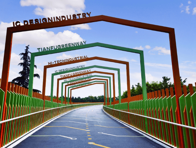 桥梁位于高新西区绕城高速外侧西区大道,全桥长652米。以“智慧交互”为设计理念,提取“高新橙”+“天府绿”为主题色彩,打造具有现代科技风格的景观桥梁。