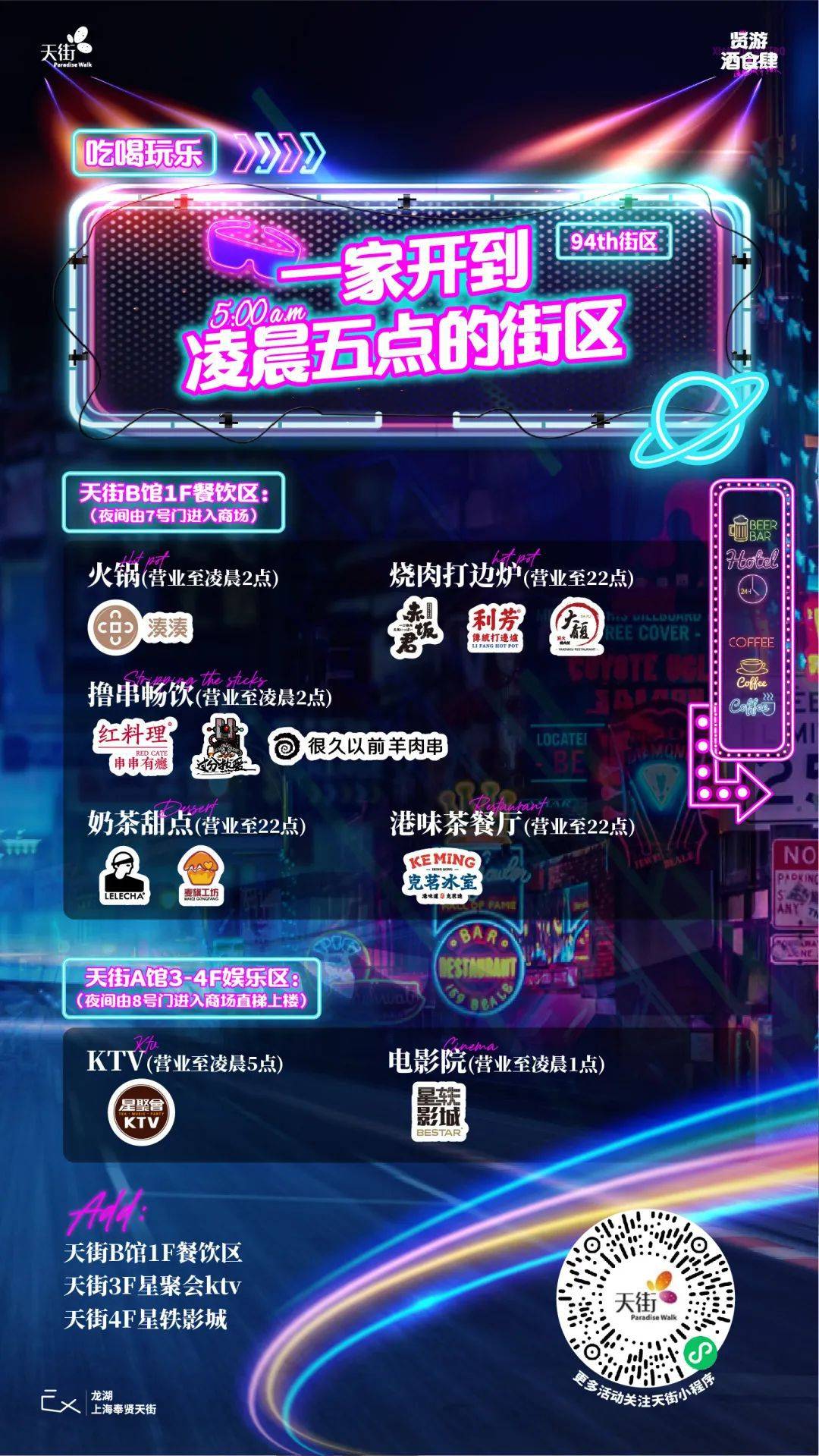 奉贤天街一条最晚营业至凌晨5点的街区,名为94th街区,也可称为“酒食肆街区”,畅玩酒食肆,遇见人间烟火。这是一条包含了火锅、撸串、烧肉打边炉、港式茶餐厅、奶茶甜点、KTV、电影院七大品类共计12家餐饮娱乐业态品牌的夜间服务,为南上海夜生活提供了一站式的便捷服务。