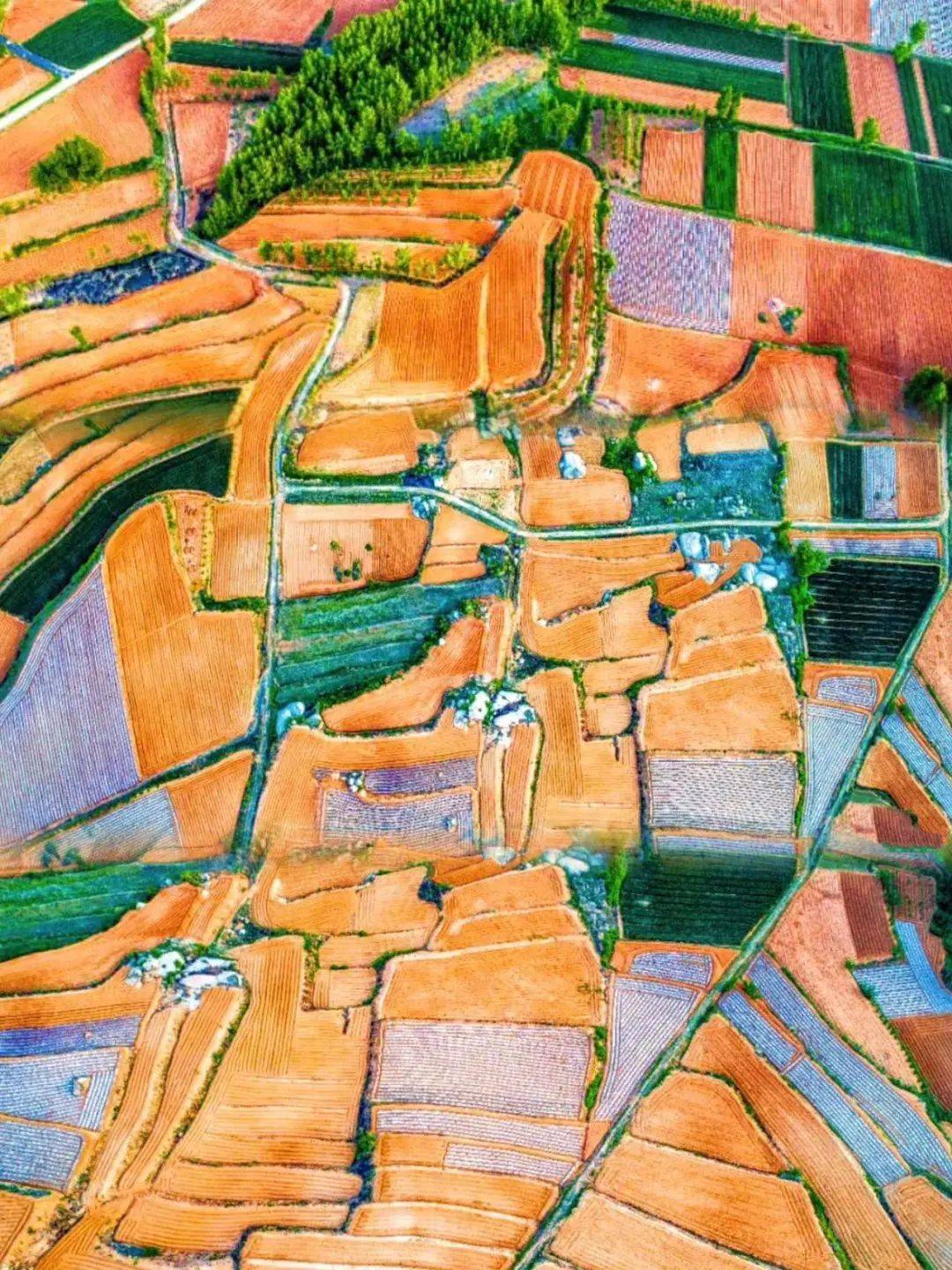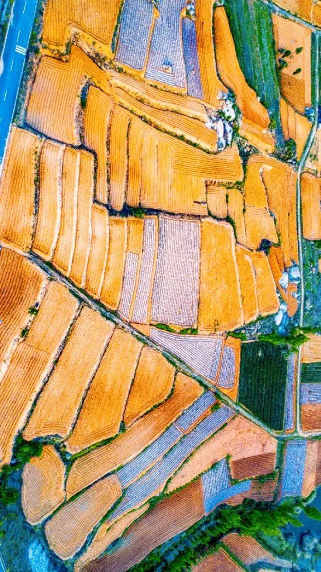 田地里小麦等各种农作物长势喜人,丰产丰收在望,连绵的群山与五颜六色的梯田相互映衬,错落有致的梯田随着山势的上升呈现成不同的颜色,远远放眼望去宛若大地的“调色盘“。