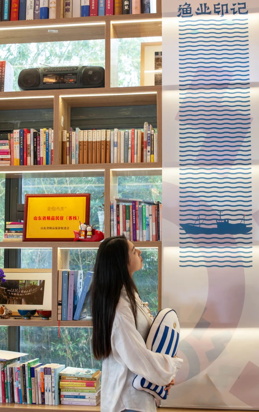 民宿主老闫是土生土长的日照吴家台人,海边出生,渔村长大,从小心里就有个传承海洋渔业文化的梦,于是在2014 年他便开始着手建设属于本地的海洋渔业文化展览馆。建立渔业记忆博物馆的过程并不容易,先是对本地海洋渔业文化进行系统梳理,收集各式大小木船50余条。再开始改造空间成立海洋渔业文化文创工坊。老闫修复渔船框架时从附近吴家台和任家台等渔村请来多位有着丰富经验的老渔民参与。年龄都在花甲和古稀之年的渔民说起当时航海的故事时眼里都亮晶晶闪着光,远航打渔是他们为之自豪并奋斗终生的事业。