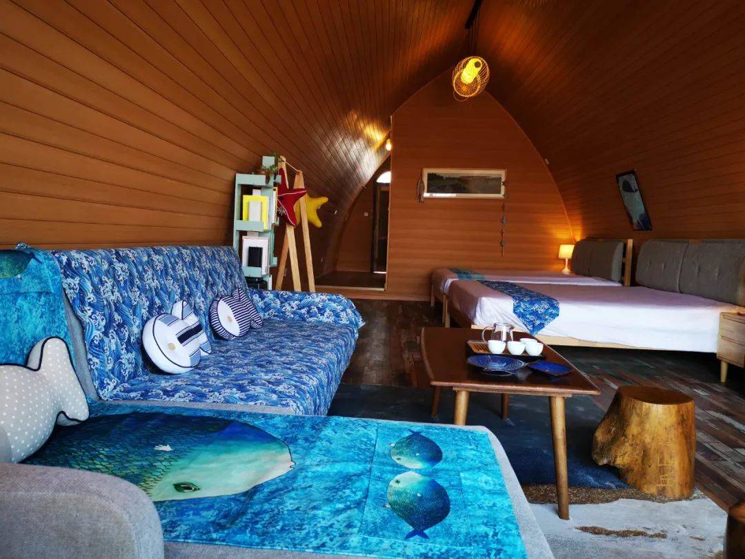 船坞错落于茶园里,尖顶圆身。远眺船坞像半靠岸边的渔船,船头有巨大圆形的落地窗,室外是延伸的大景观露台。屋内的布艺软装,让旅人在享受渔业文化的同时又不失亲切感,坐在屋内的沙发上也能看到远处的海岸线。渔船民宿过去是收藏渔业生产老物件的,因为体积太大,维护的费用又过于高,所以通过改造利用,将报废的渔船进行艺术化改造提升变成民宿。渔船上的各种老物件也被巧妙改造,变成船坞民宿中别出心裁的创意装饰物件。
