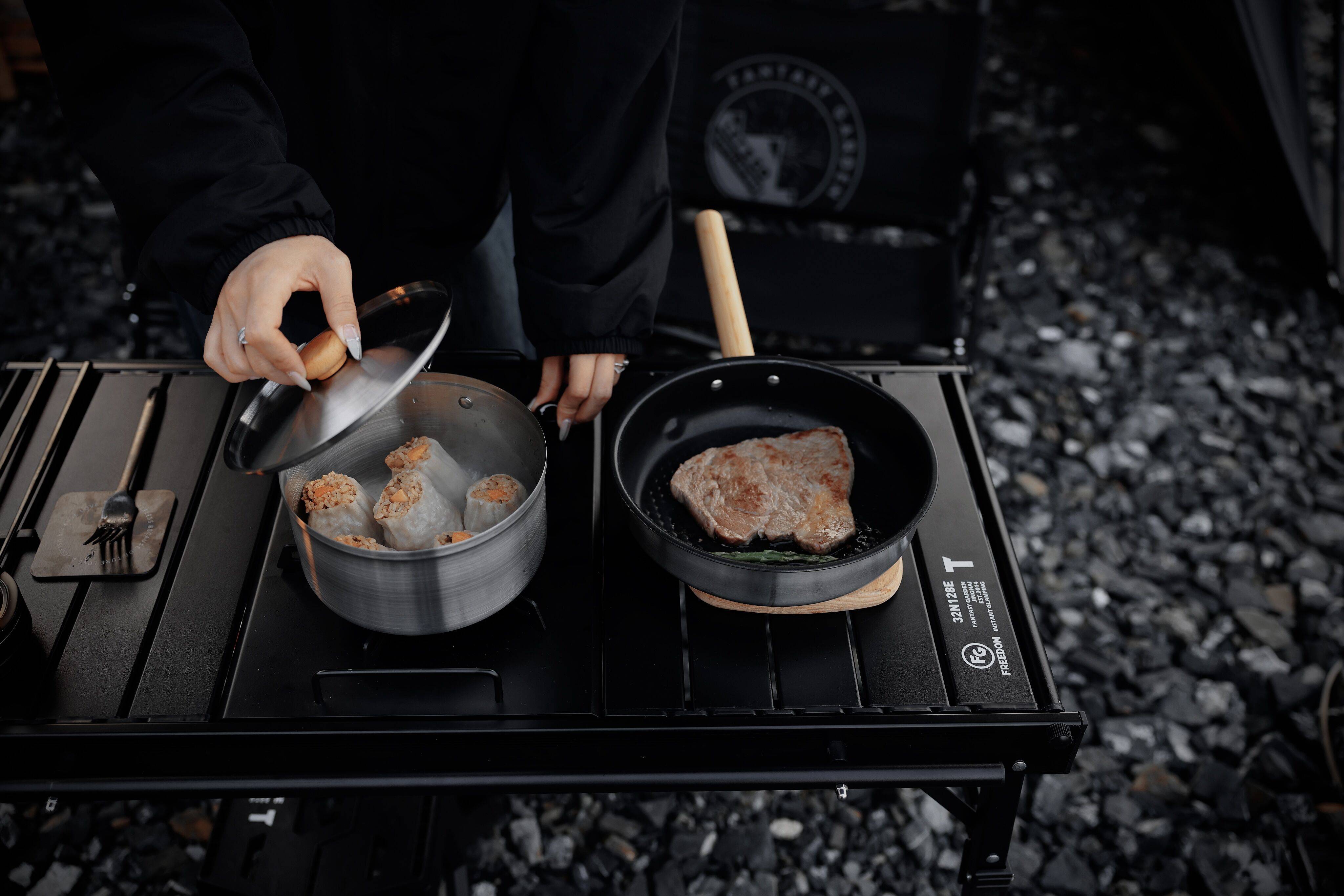 食材准备到位,烹饪锅具、饮食餐具,也要一并带上,在山野中,解锁你的“大厨风范”,美食上桌、快乐颇多。
