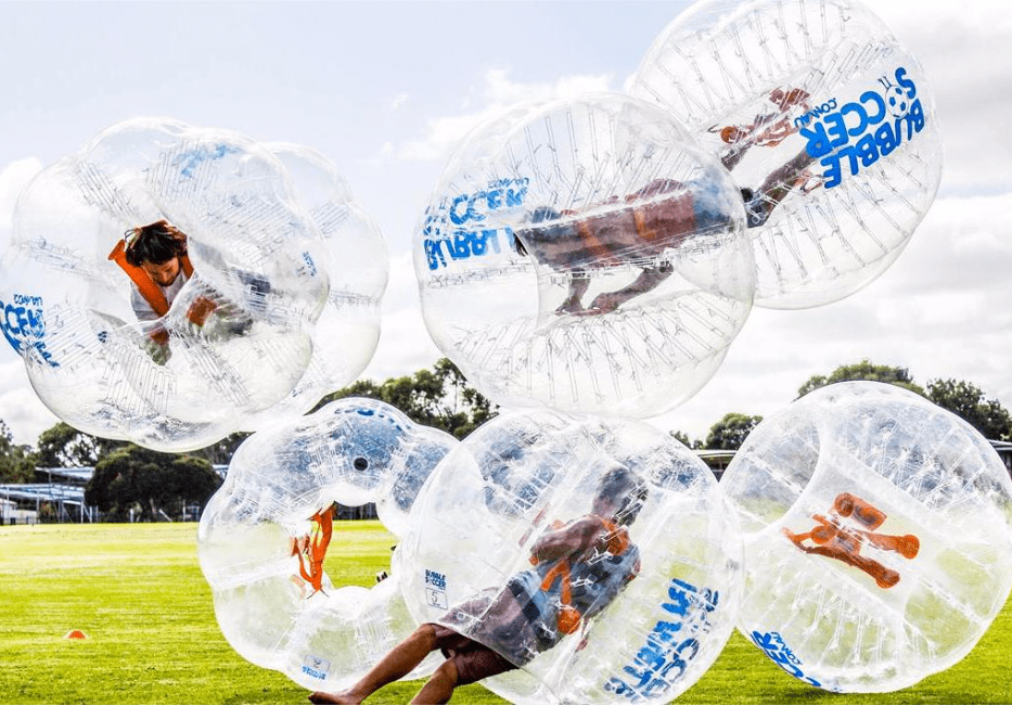 【泡泡足球】在露营草地,球员上半身包裹在透明塑料太空球中,只露出腿来进行足球比赛,感受相互碰撞的乐趣,反复弹跳营造趣味横生的活动氛围;