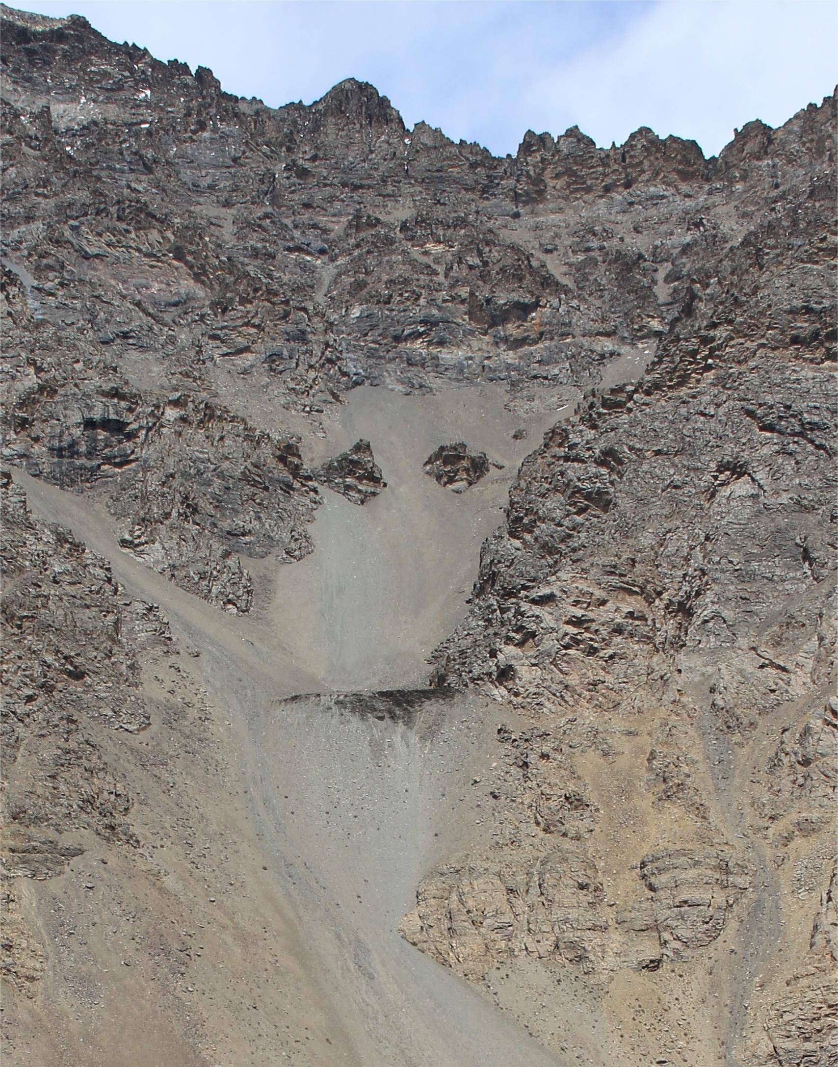 返程途中拍摄到公路另一侧山体,山体流沙上端多么像一个人的双眼,在日夜间注视着对面的冰川。