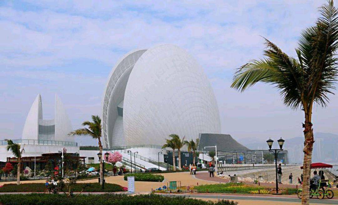 珠海大剧院位于珠海情侣路野狸岛海滨,由一大一小两组“贝壳”组成,具有特色的外观造型,是珠海重要的“文化地标”。