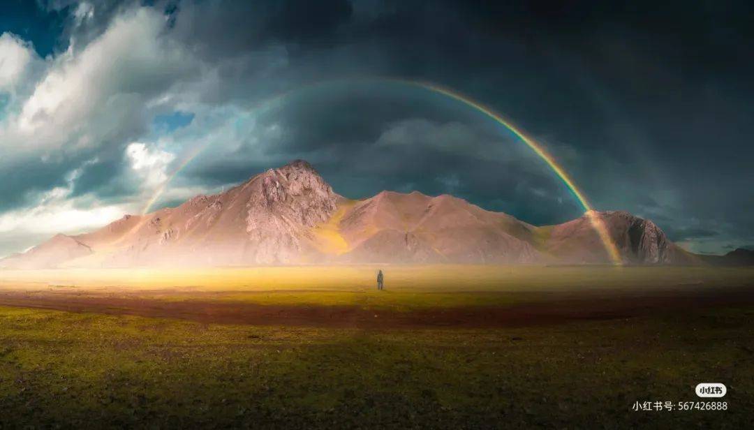 广阔的新疆,沿途有美景,迎面就是光。透过雨后的水汽,完整的彩虹出现在广阔的独库公路。