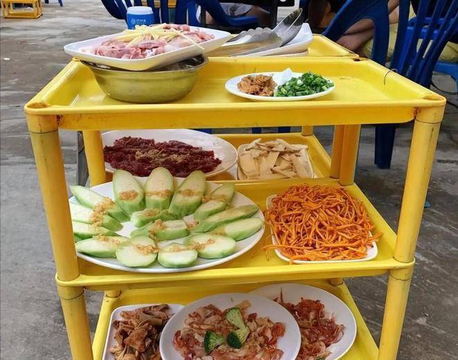 有两位婺源的情侣来海南三亚玩,他们吃了各种海鲜米粉之后,听当地人介绍,说海南的蒸菜也很出名,这两位年轻人就找了一家蒸菜馆,慕名来试一试海南的蒸菜。这家店在一个村子里面,环境就是大排档的环境,宽敞而且很通风,店内除了卖蒸菜还卖烤乳猪,也是当地的特色。