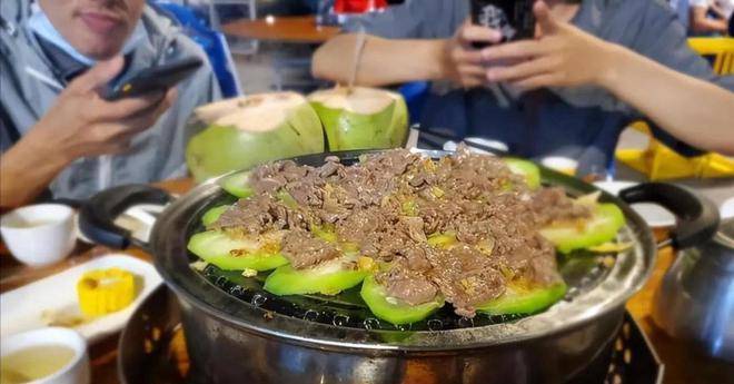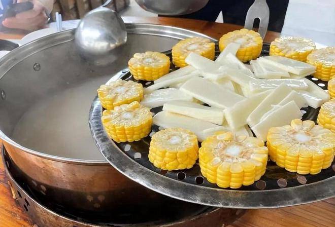 因为之前已经吃过烤乳猪,所以他们二人只是留着肚子吃蒸菜,点了一份桑拿鸡、一份牛柳,还有铁棒淮山药、丝瓜、玉米等等。这里的蒸菜和江西的蒸菜截然不同,是直接端上来一个锅,锅里是桑拿鸡的汤底,锅上盖着一个蒸网,然后把各种食材放在上面,铺好之后盖上锅盖蒸大概四分钟,就可以掀开锅盖开吃了。