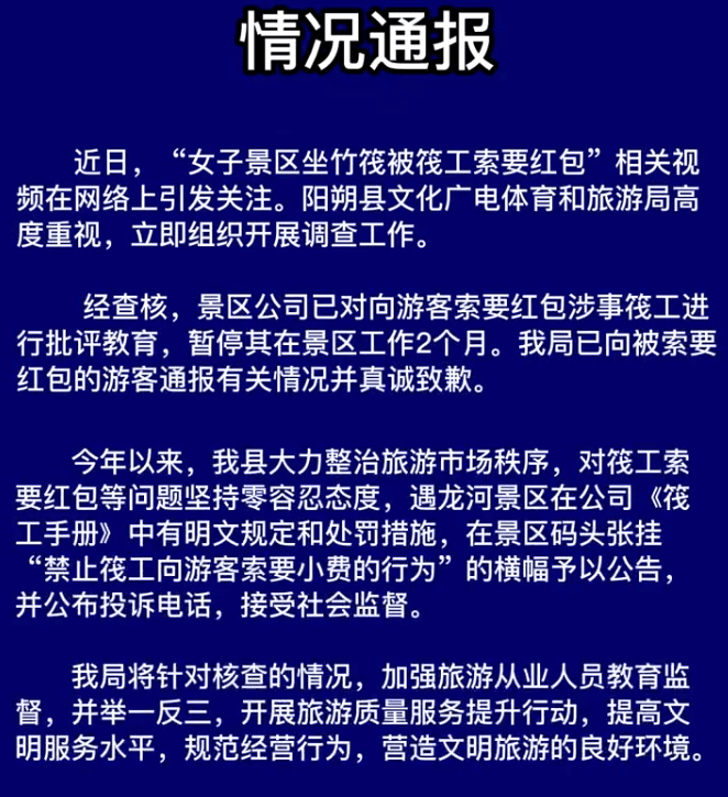 经查核,景区公司已对向游客索要红包涉事筏工进行批评教育,暂停其在景区工作2个月。我局已向被索要红包的游客通报有关情况并真诚致歉。