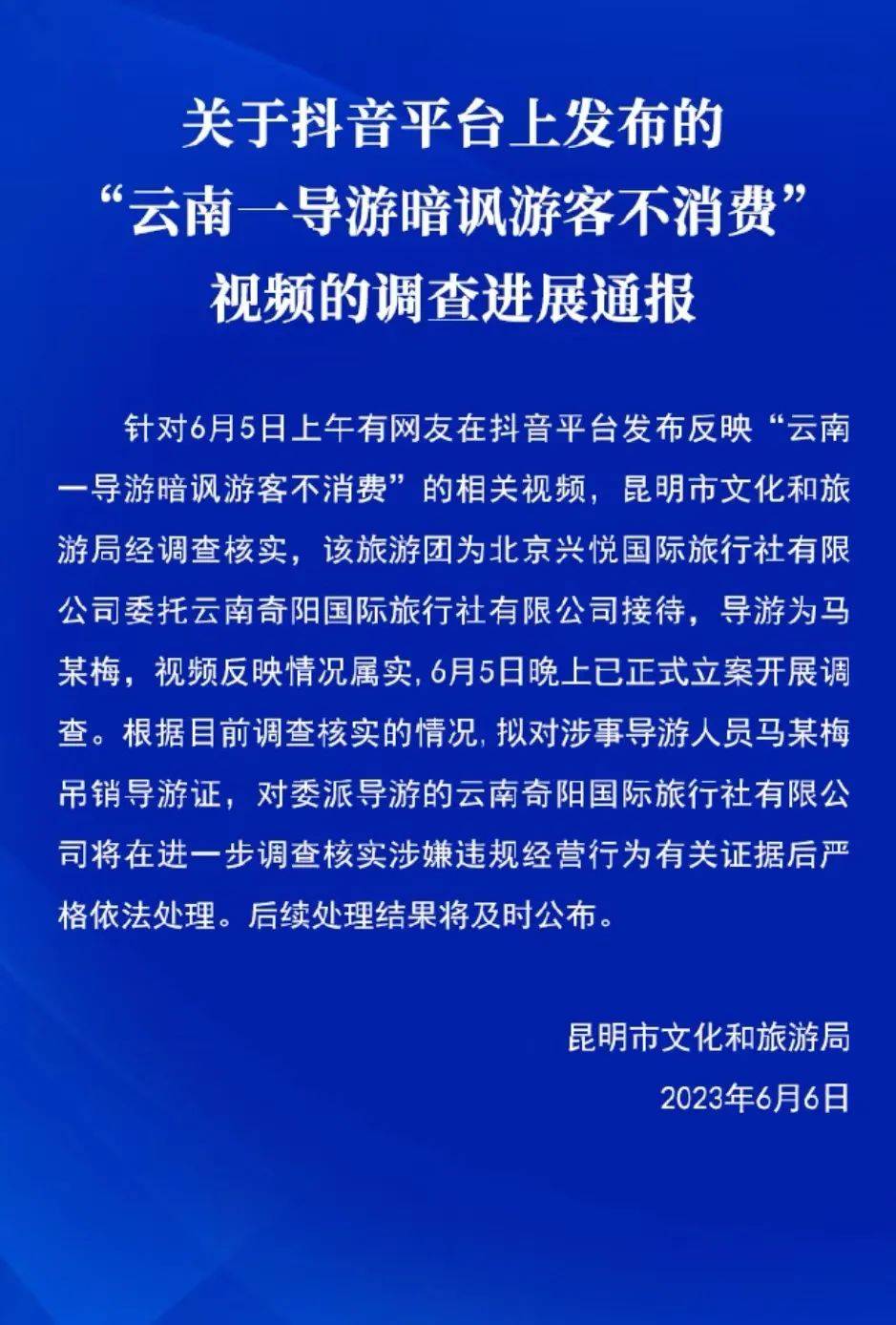 “针对6月5日上午有网友在抖音平台发布反映“云南一导游暗讽游客不消费”的相关视频,昆明市文化和旅游局经调查核实,该旅游团为北京兴悦国际旅行社有限公司委托云南奇阳国际旅行社有限公司接待,导游为马某梅,视频反映情况属实,6月5日晚上已正式立案开展调查。
