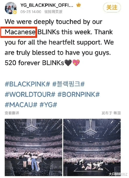 “Macanese”翻译过来是土生葡人,也就是身为葡萄牙的后裔的称呼,BLACKPINK用这个称呼来称呼中国粉丝,YG这么大的公司,对历史对待中国文化也显然是个文盲,如果不是文盲,那么背后的“嘲讽和不重视”意味又透漏出来,这与早前BLACKPINK成员中金智秀偷取中国文化的做法类似,来中国可以赚钱,但是并不尊重中国的文化,这以后怕是再也不会答应她们来中国赚钱了。