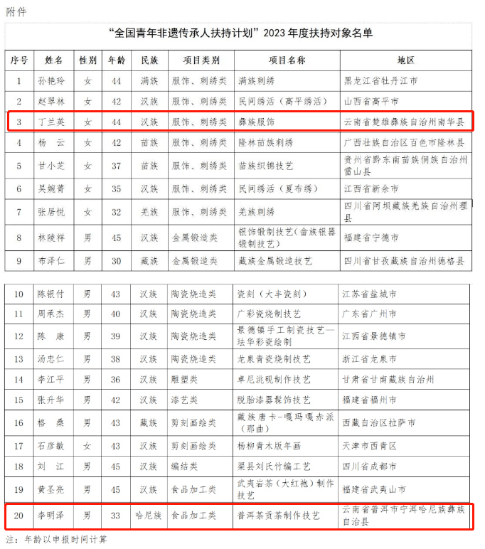 6月6日,“锦绣山西 多彩非遗”2023年文化和自然遗产日宣传活动在山西省太原市举办。活动由中国非物质文化遗产保护协会和山西省文化和旅游厅联合主办,现场发布了“全国青年非遗传承人扶持计划”2023年度入选名单,并为入选首期计划的彝族服饰项目传承人丁兰英等20位青年非遗传承人举行了授牌仪式。