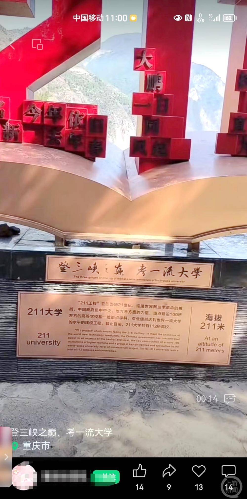 近日,重庆市民李先生称他去重庆市奉节县的三峡之巅景区旅游时,发现在海拔221米和985米设立了专门的打卡点,打卡点不仅介绍了211和985的含义,还打出了“登三峡之巅 考一流大学”的宣传标语,成为了游客热门打卡点。