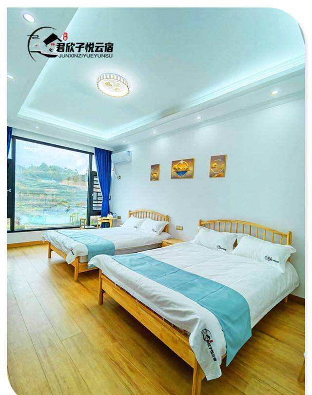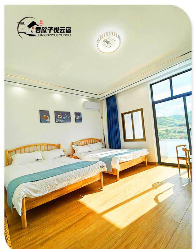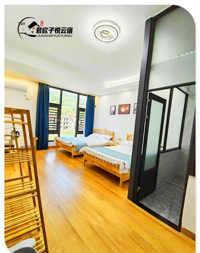 军营村君欣子悦云宿是2022年才开始投入运营的村民新建房,位于军营村九龙溪水流源头处,远离喧嚣,装修风格清新,干净整洁一目了然,房间较大,普遍趋于30平方,且大部分房间都是断桥铝落地窗,窗户大,隔音效果好,观景十分方便,相对而言在军营村很难有一栋那么多个大房间的民宿了。民宿用品齐全,配有茶歇、棋牌、电动麻将、自助烧烤等设施,还可进行篝火、唱歌、舞蹈等多种乡村特色活动可进行。温馨的住宿环境、家人般的体贴服务让许多游客到君欣子悦云宿这一民宿就有很深的亲切感。