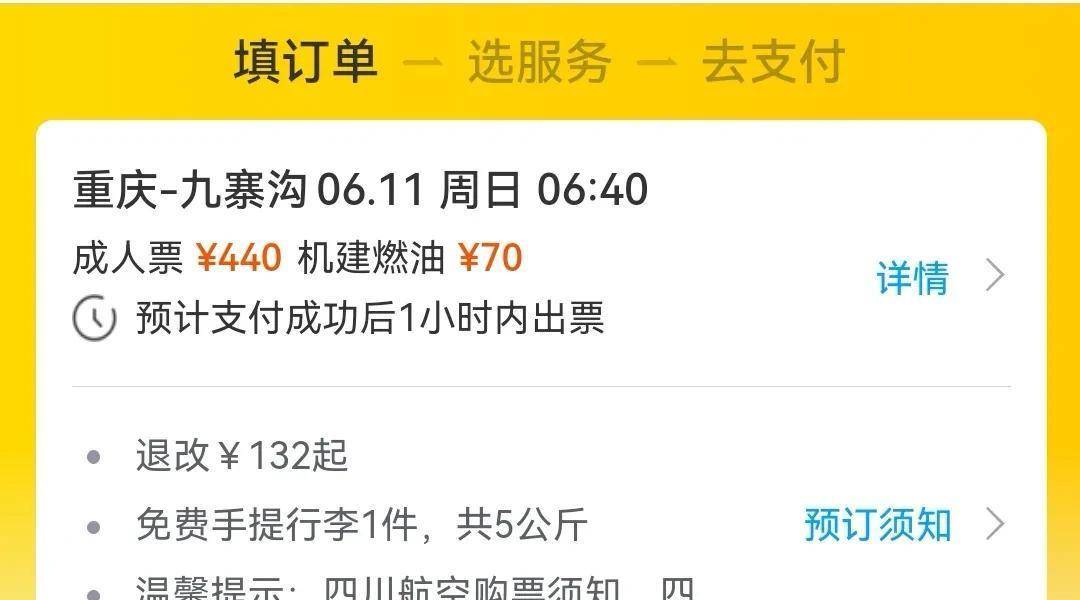 6月11日,从重庆到九寨沟可以乘坐直达航班,花上490元机票加机建燃油费,在早上八点就能到达九寨黄龙机场。机票价格不是一成不变,有时会高一些,我看了看返程机票,发现从九寨到重庆的票价比去程较高。不过恢复了航线总归是好的。