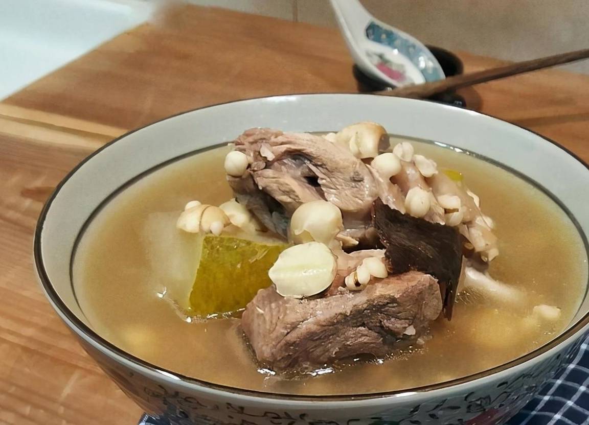 ?5、将老鸭、薏米、莲子、红枣、陈皮放入汤煲中;倒入清水,没过食材,煮开后转小火煲一个小时。