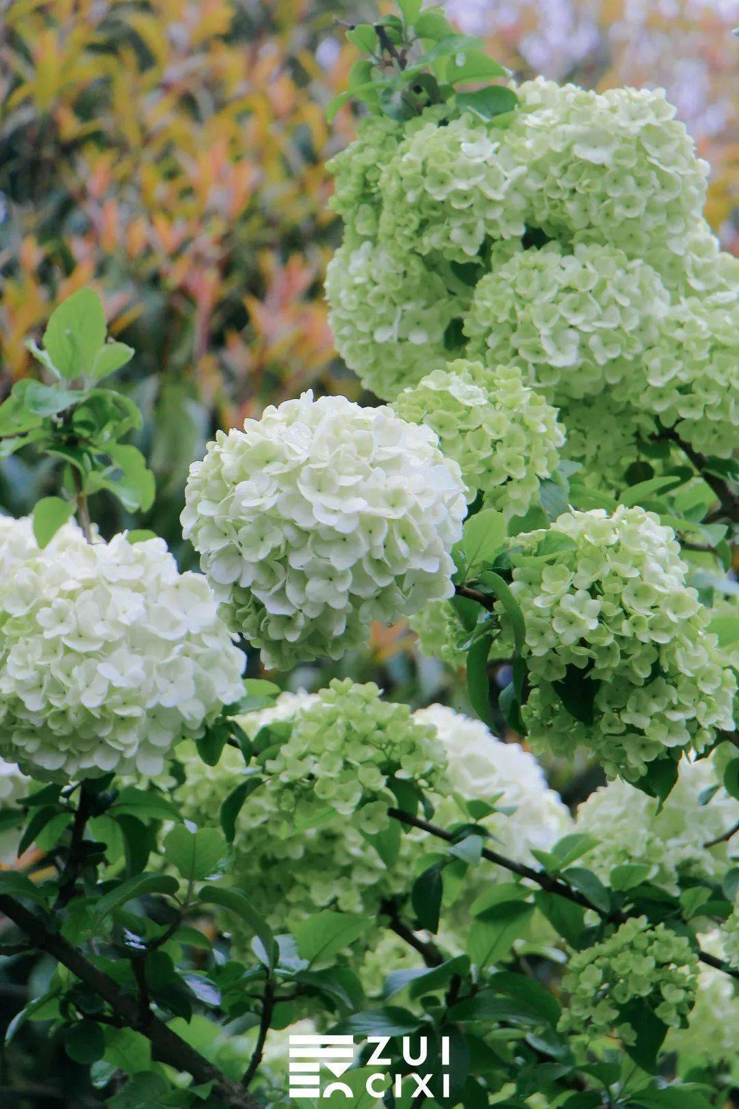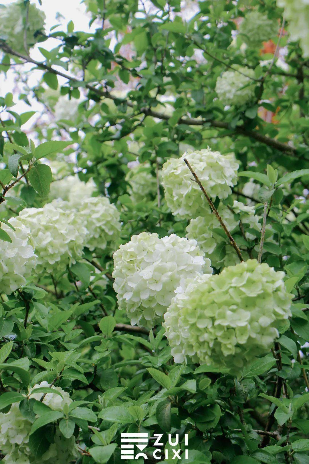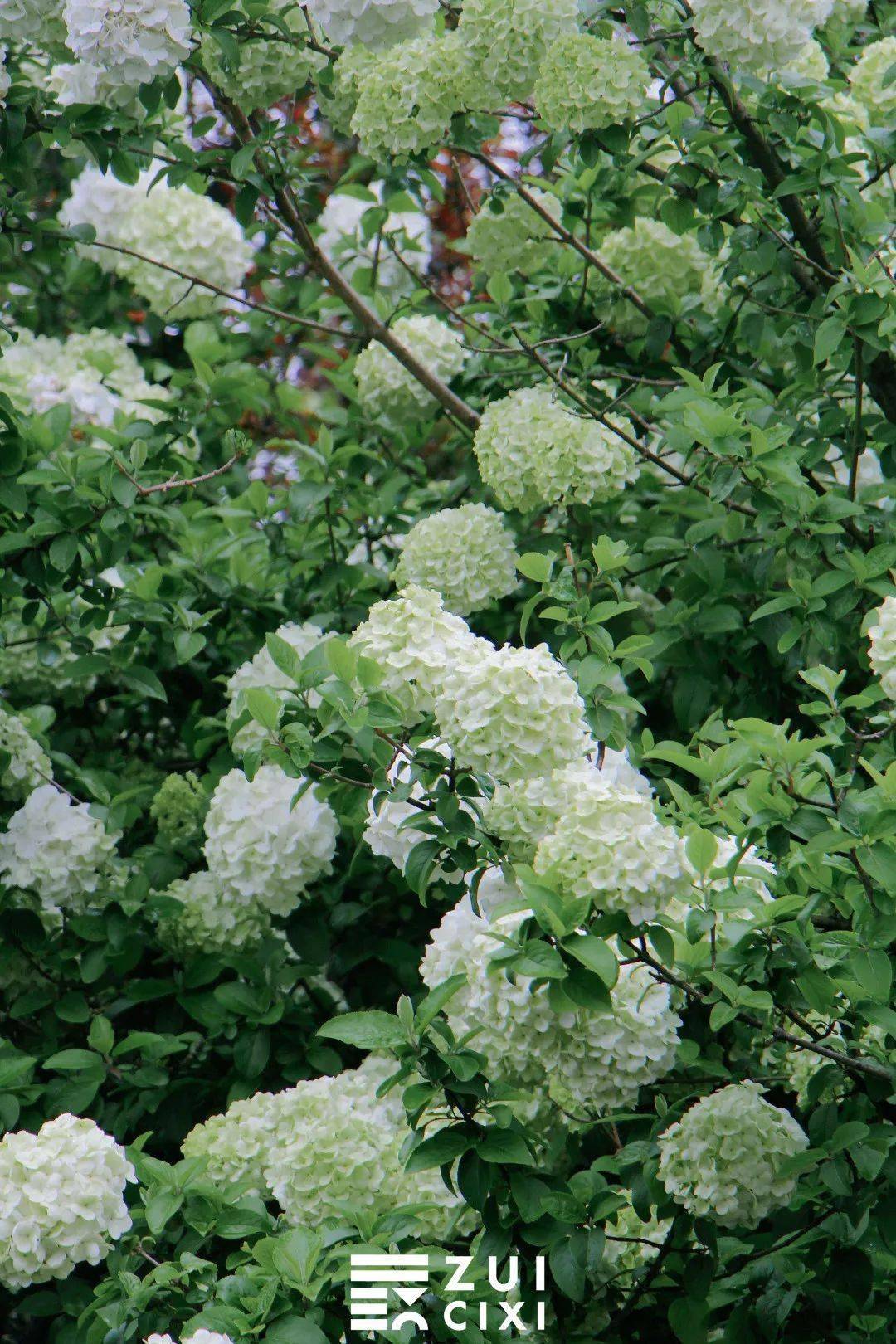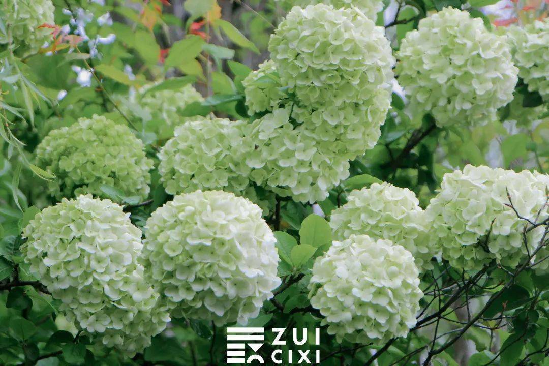 如果将相机取景器再拉近一点,便能看到青绿色的木绣球中还夹杂着几个白球,这样的 青白渐变色也别有一番风味,看着像一个个香草冰淇淋,让人忍不住就想到即将到来的夏天。
