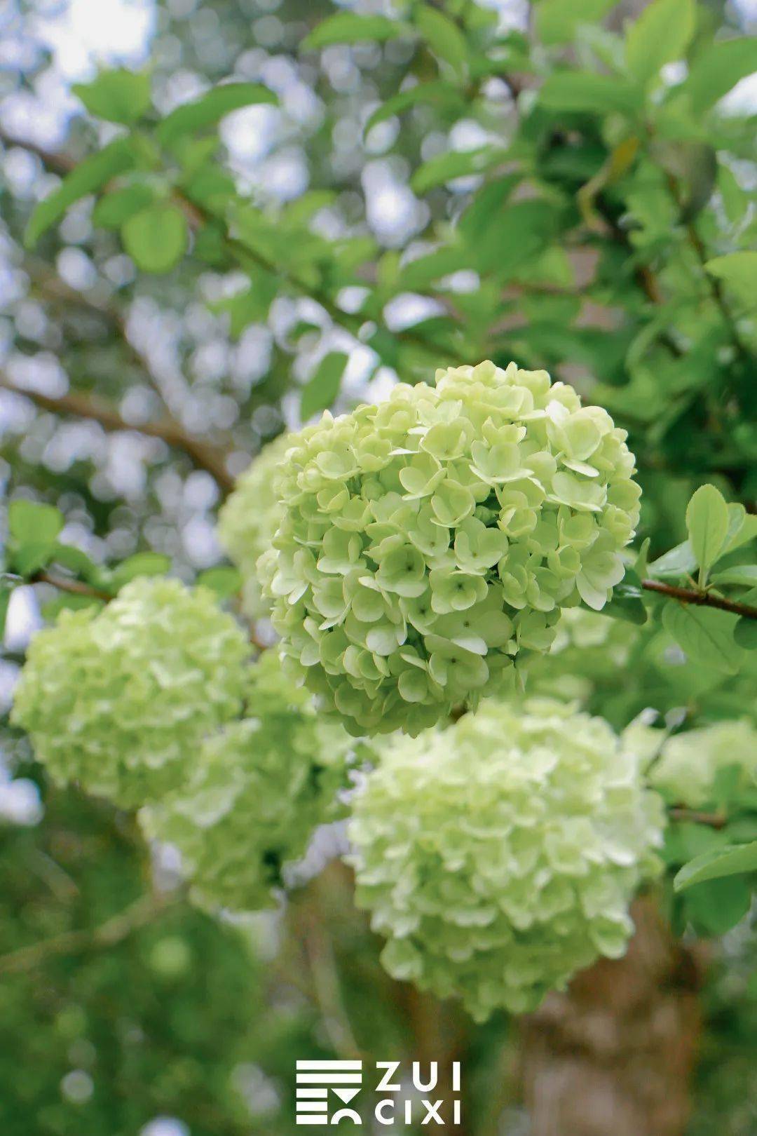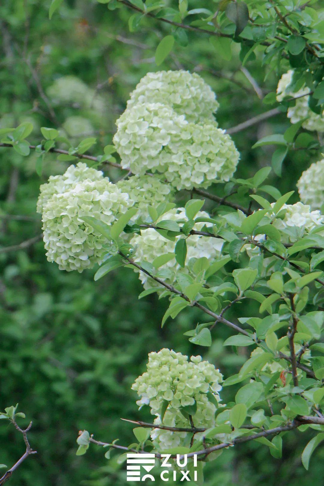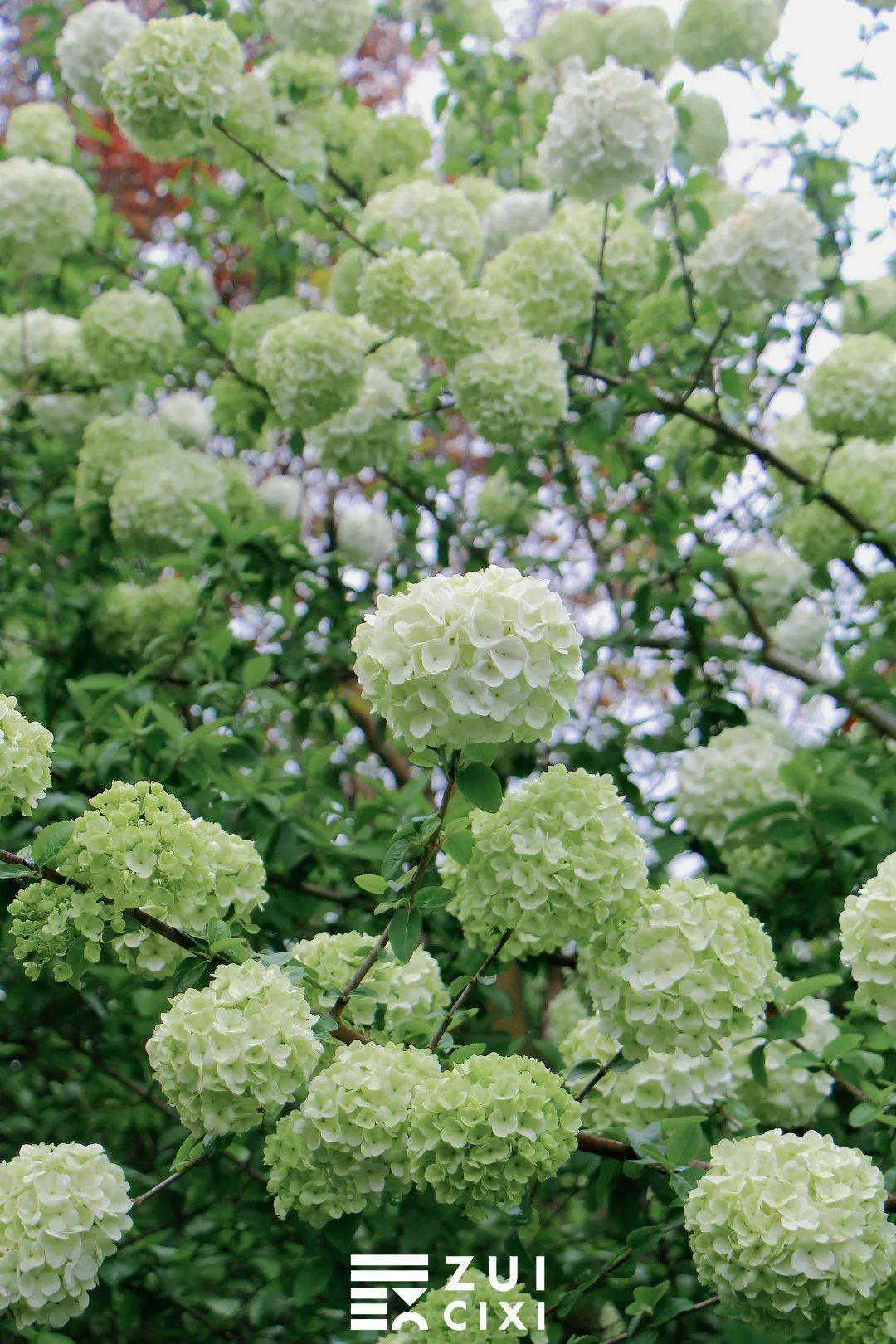 如果将相机取景器再拉近一点,便能看到青绿色的木绣球中还夹杂着几个白球,这样的 青白渐变色也别有一番风味,看着像一个个香草冰淇淋,让人忍不住就想到即将到来的夏天。