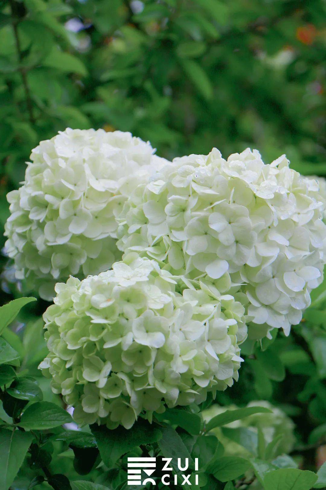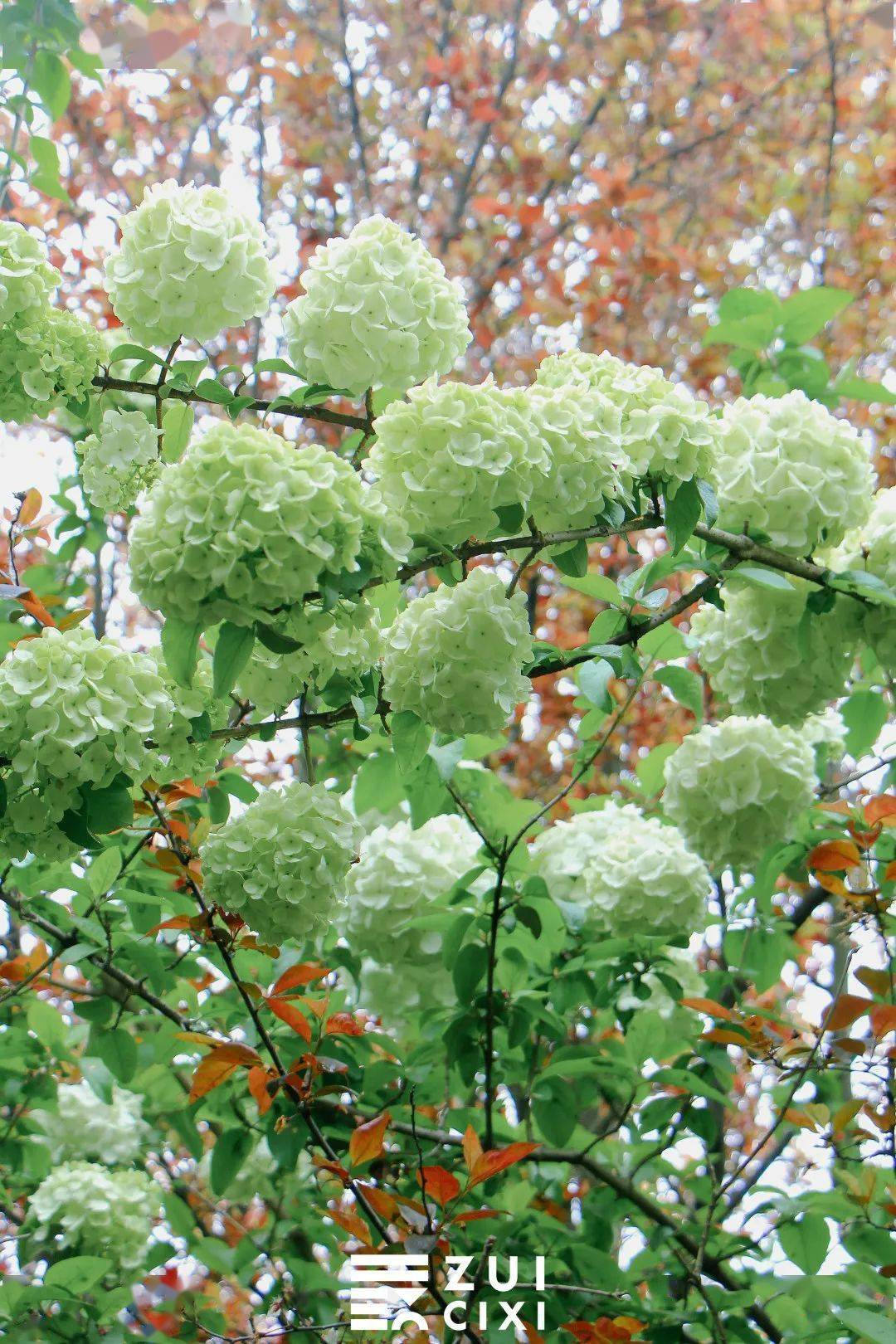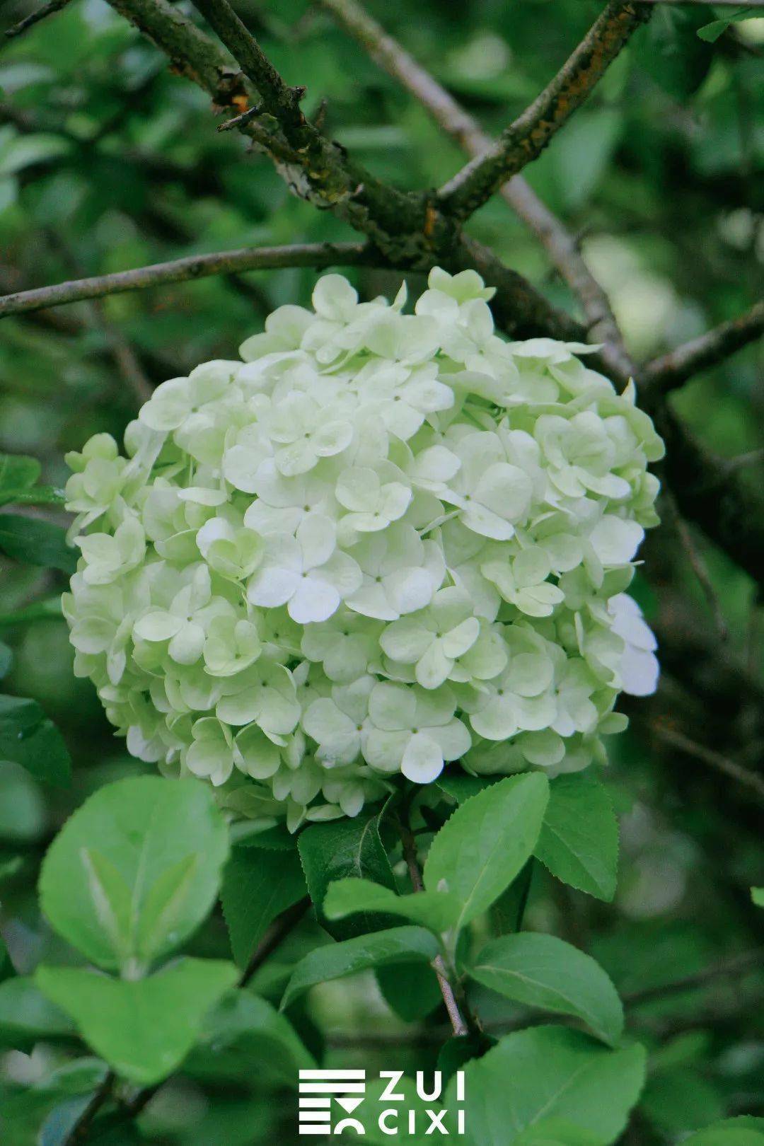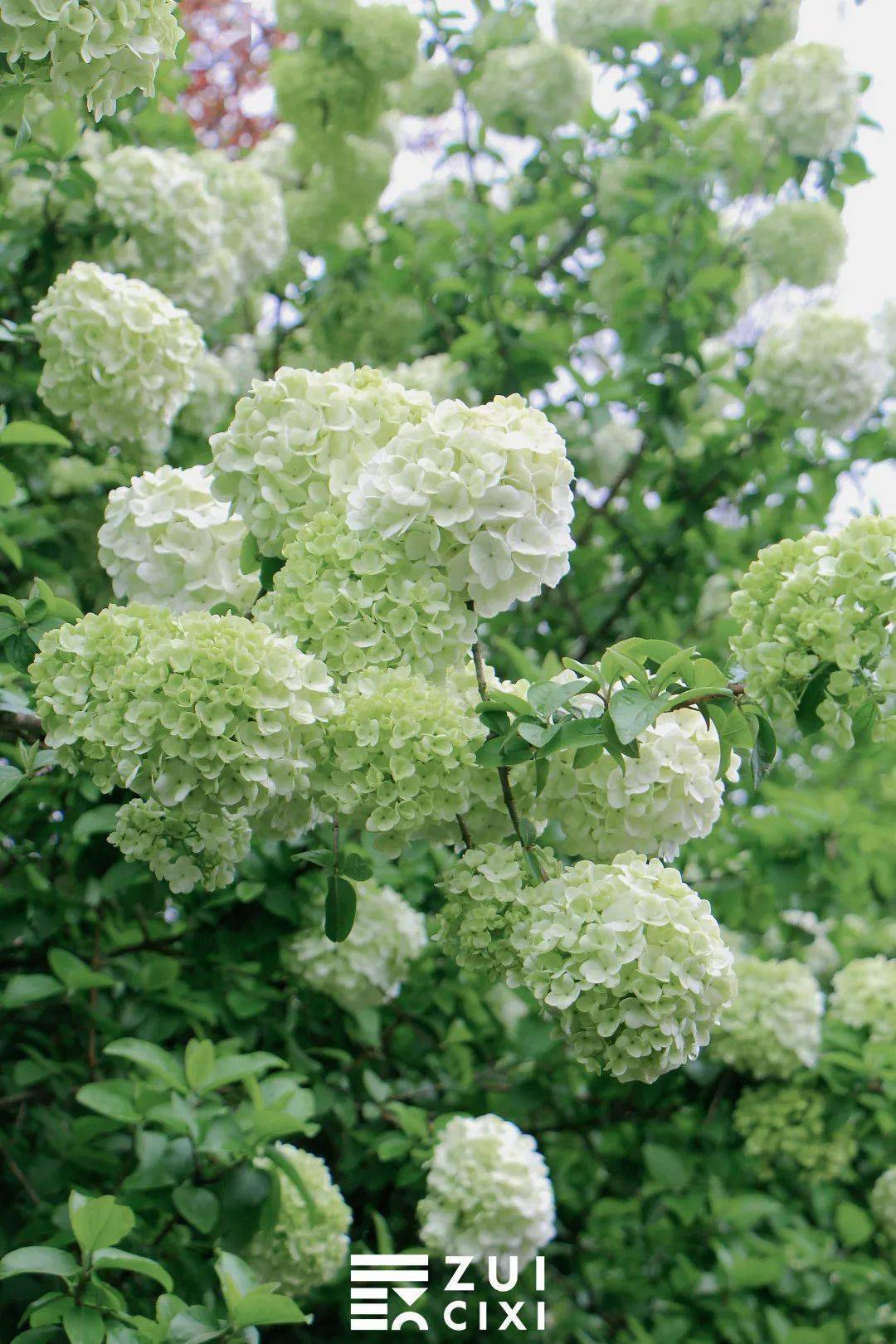 如果将相机取景器再拉近一点,便能看到青绿色的木绣球中还夹杂着几个白球,这样的 青白渐变色也别有一番风味,看着像一个个香草冰淇淋,让人忍不住就想到即将到来的夏天。
