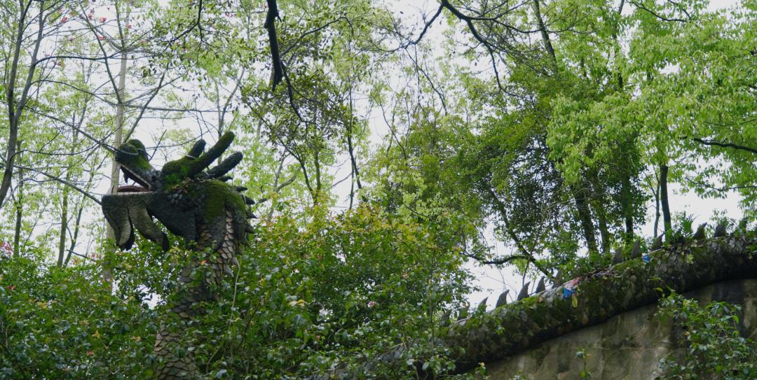 抬头,望见院墙上有条巨龙盘踞,昂首挺胸,形态矫健。龙头和龙身上覆盖了厚厚茸茸的青苔,给这条龙又增加了起伏凸凹光影明暗,厚重的质感。