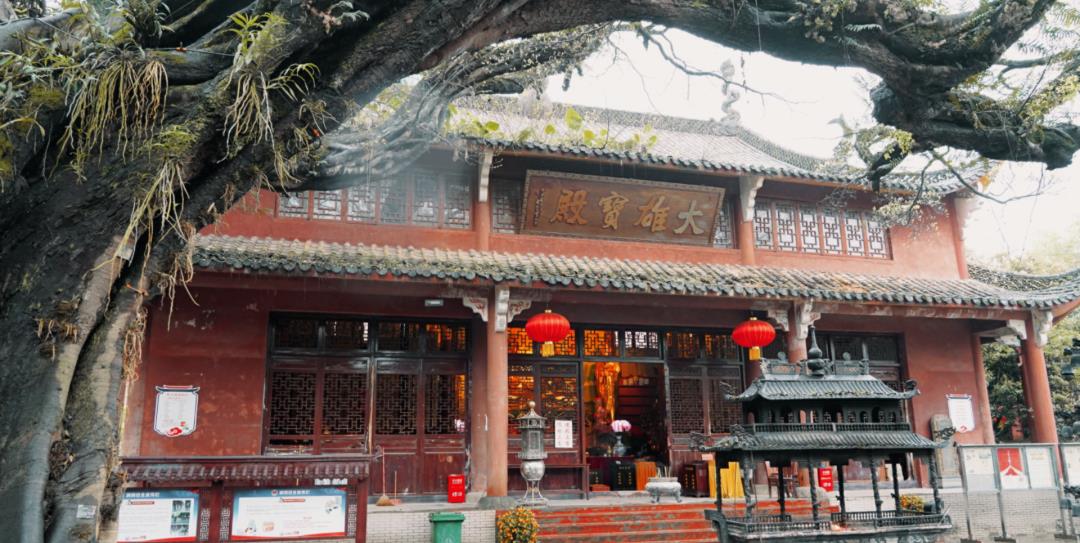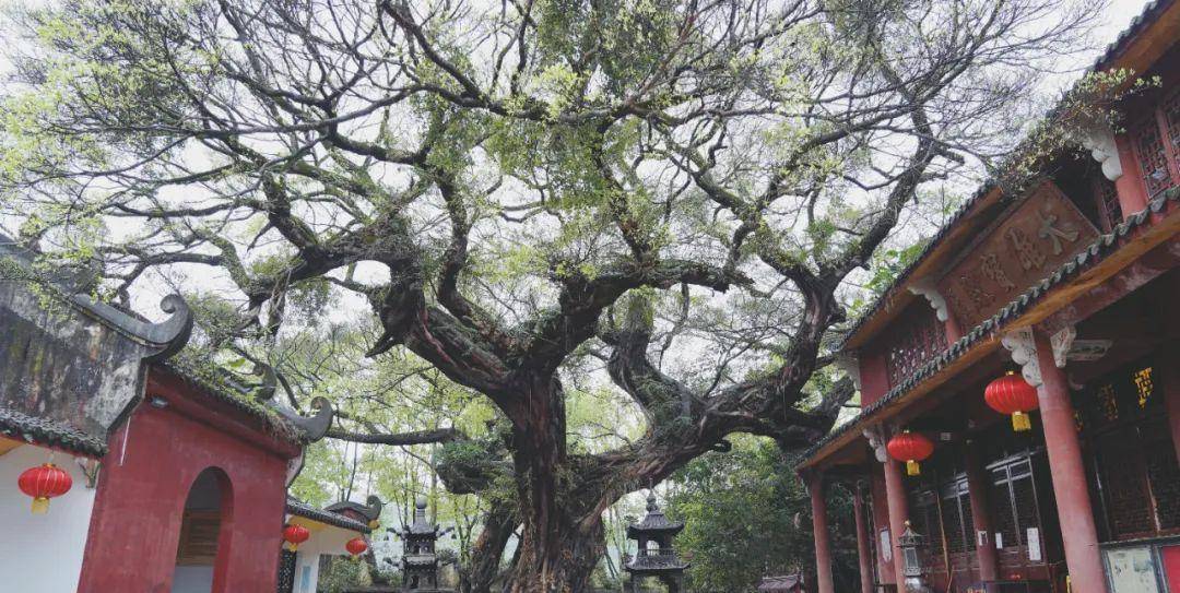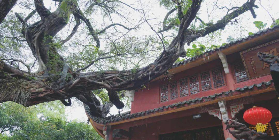 穿过山门殿是大雄宝殿。一棵苍劲伟岸的千年古榕挺立在殿外。虽树干布满沧桑,却仍不乏生机,巨大的树冠向四面铺展。更妙的是,有一根树干已经连接到大雄宝殿的房檐下,像柱子一样托住宝殿。大自然的神来之笔,信手拈来这绝妙一景,让寺中处处有禅意。
