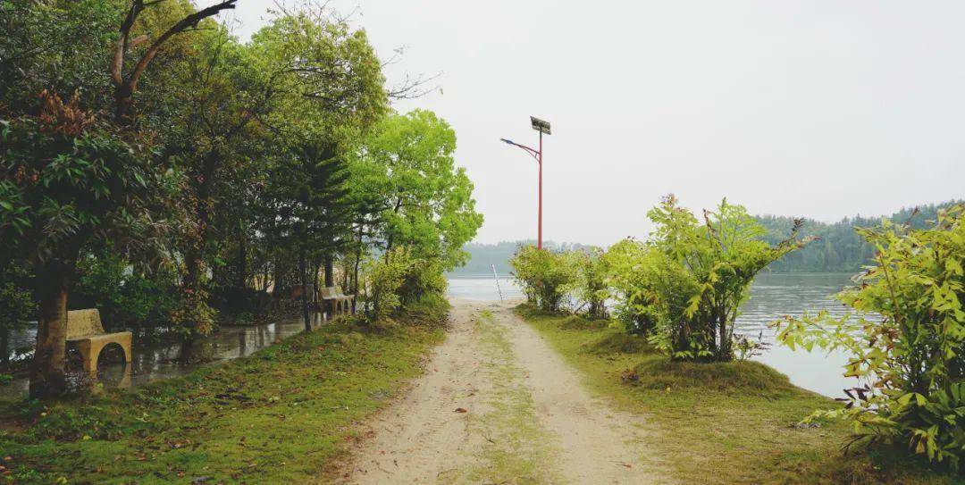走出寺院,就到了慈湖边,地上满是细沙。湖光山色沙滩,极度闲适。湖边还很贴心地设有观湖长椅。若不是下雨,很想在这椅子上坐一坐,好好体会这千年古刹难以言说的情境。