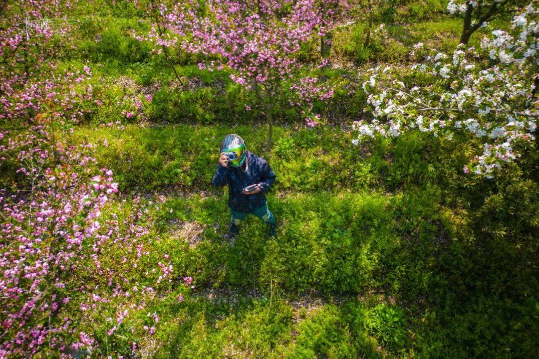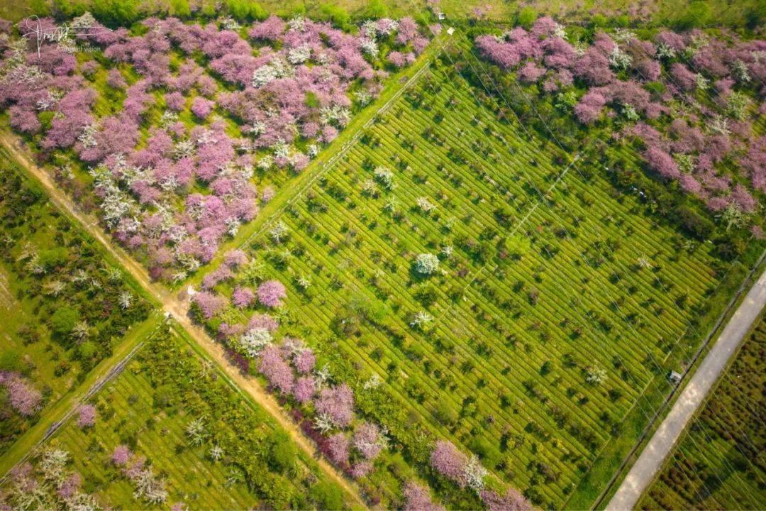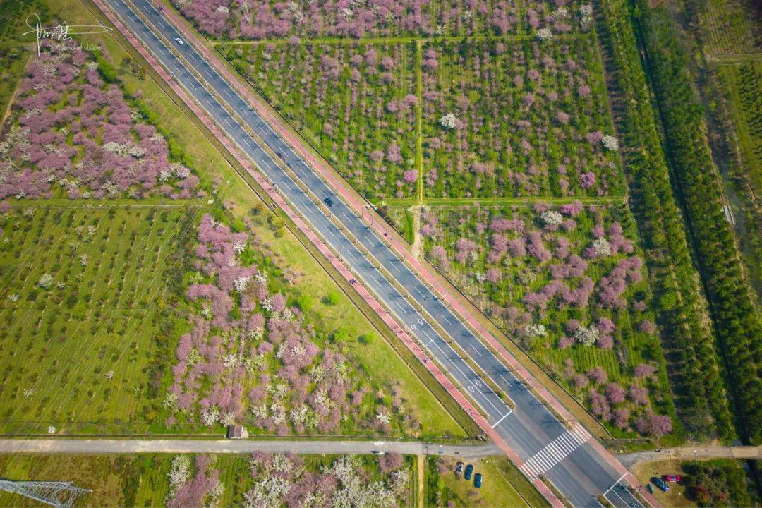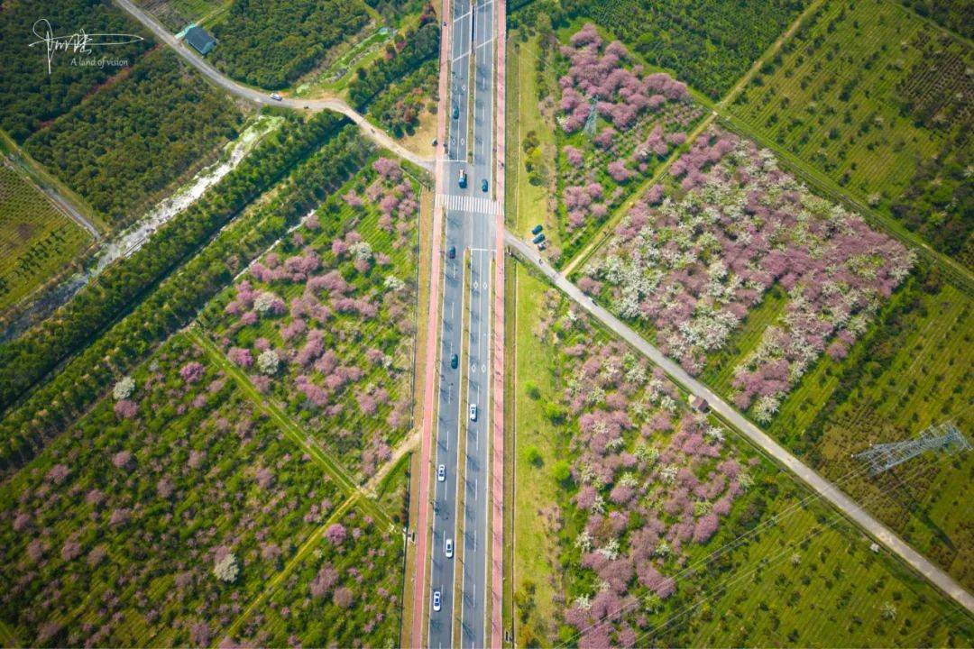 通过航拍视角,可以看到这片花海的面积着实不小,并且从中被交通要道“长虹街”截断,一分为二后却依然壮观。而离主路较远一点的树林深处,还种植着其它苗木,目测田埂间郁郁葱葱,很有点“绿野仙踪”的氛围感。