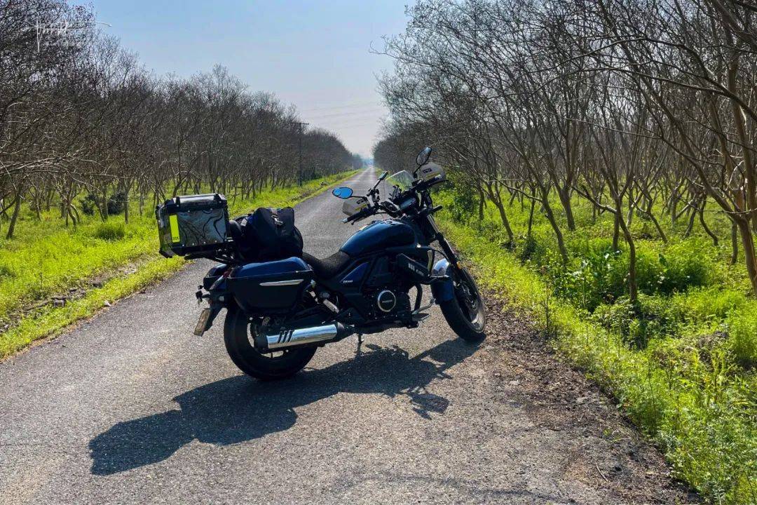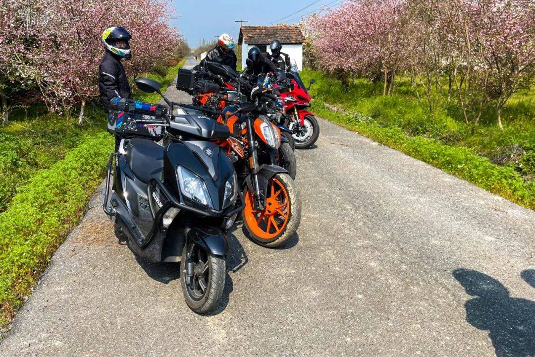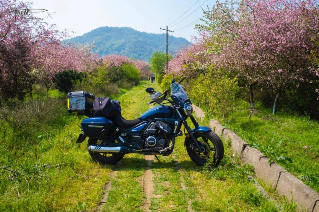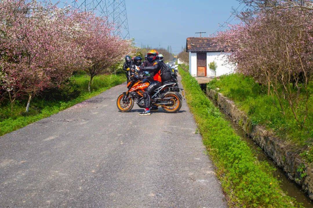 发现这片花海纯属偶然,因为在路过德清县的长虹街时,刚好碰到一队摩友在路边聚集,于是多关注了几眼。然后立刻就被他们身后的鲜花小树林给惊艳到,当即跨着TR300在下一个路口掉头,准备前往打卡。有趣的是好像同样心态的路人不少,临时转弯下车拍照者“络绎不绝”。