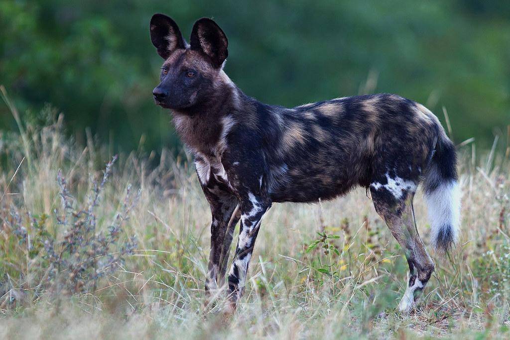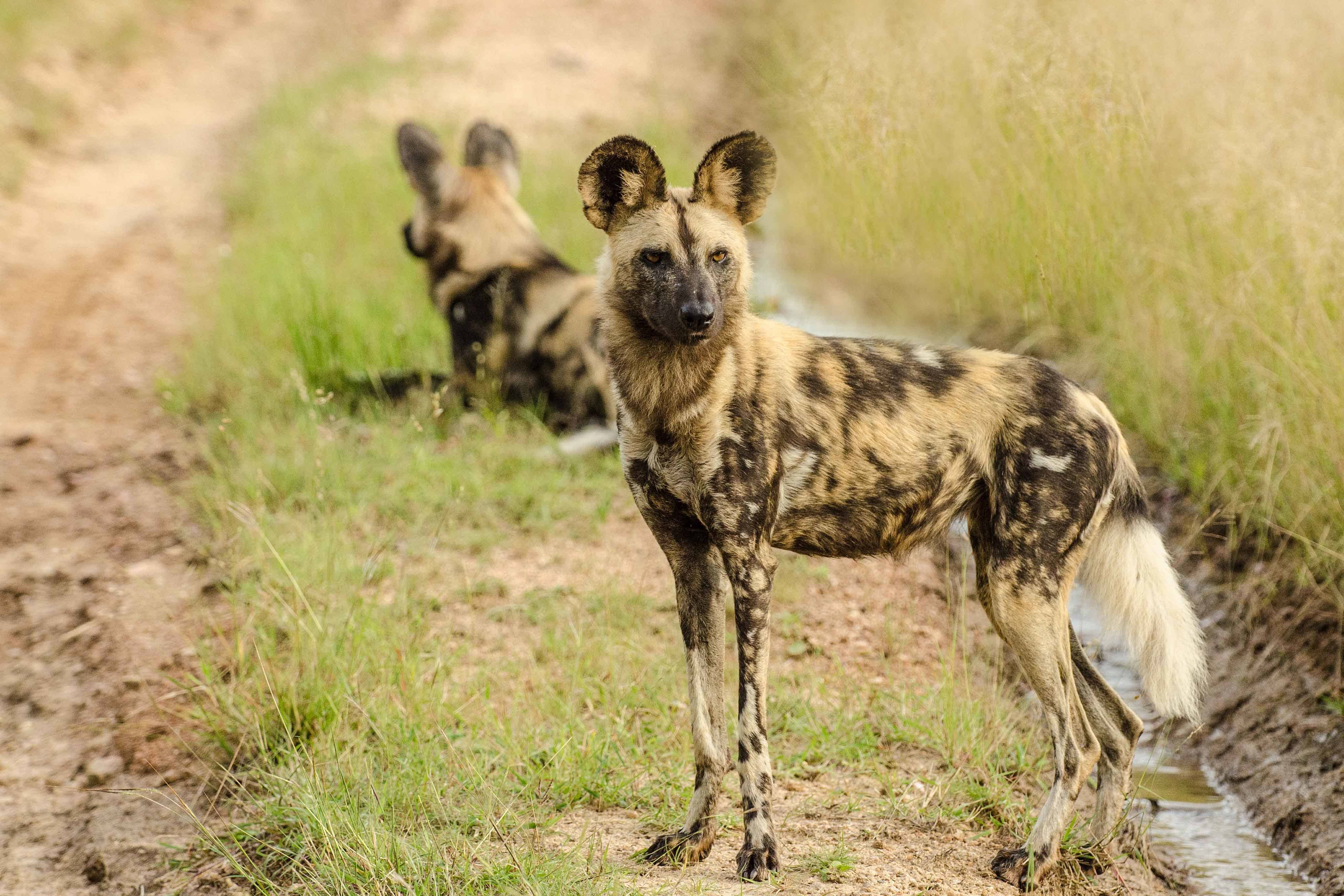非洲野犬,又称杂色狼,体长100厘米,尾长30-45厘米,体重17-36千克。毛色杂乱,包括黑、黄、白等,每个个体斑纹独特。前肢无爪,前臼齿较大。喜欢群居,并通过叫声沟通。它们以合作狩猎中型有蹄动物为生,追击速度可达45千米。分布于非洲东南部草原、灌丛和稀树草原。数量减少,仅剩约3000只,津巴布韦皇日国家公园为保护区。