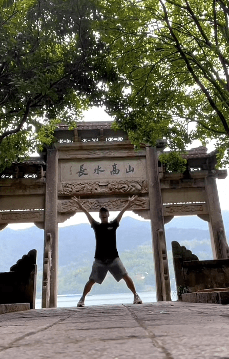 孙浩在视频中向大家讲解这次来到的地方是杭州的富春江,山水环绕的景色很是宜人,孙浩站在景区石门前摆着各种姿势拍照,高兴得就像是孩子一样。