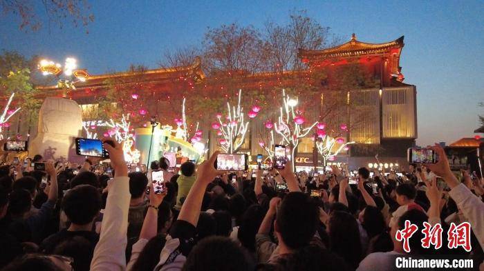 离开水泄不通的“盛唐密盒”舞台,依然能感受到游客们的阵阵热情。在大唐不夜城街区上,类似的表演每天都会上演。