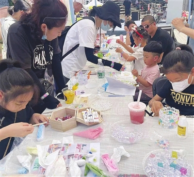 6月3日,天津智慧山文化创意产业园(简称智慧山)山丘广场,一场主题为“艺起成长·儿童嘉年华”的市集吸引了很多家长带着孩子前来参加。在儿童服装设计的摊位前,孩子们拿着一针一线将手中炫彩的布料以自己的设计思路装扮着眼前的模特;在手作摊位前,孩子们排排坐,专注地制作着笔筒、铅笔盒、发卡等物品;在“追光里戏剧创习社”的摊位前,工作人员给孩子们表演了《爷爷的春天小岛》的偶剧,在戏剧的情境下引导孩子建立“面对离别”的不同情绪认知……这场市集一共有80家商户,其中艺术类占七成。“这是我们做的第四届儿童主题的市集。”智慧山品牌中心负责人魏彬告诉记者,该市集2天累计客流量约3600人。