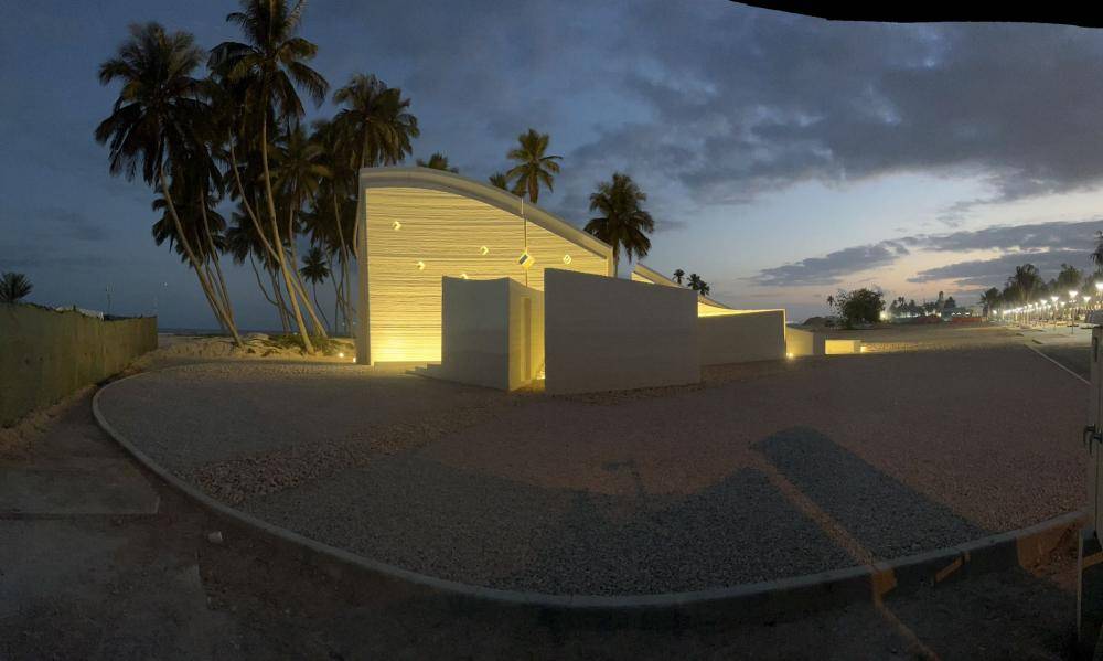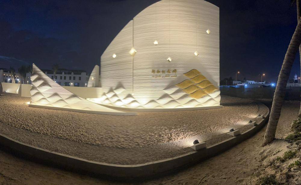 将近十米高的碑体,展开如同云帆一般,落下去的曲线和另一侧的碑面形成夹角,如同宝船的船首。纯白的碑体,采取3D打印技术形成的波浪形的碑面,既显示了高科技建筑的水平,又体现了东方艺术的美感。