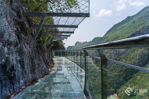 乘坐观光车到达老山栈道入口,目之所及皆是绿意,从山顶往下看,一条栈道顺延而下,盘旋于老山大峡谷的悬崖峭壁、奇滩异石、密布丛林之间。“这是即将完工的老山栈道,栈道全长约3.6公里,分为仿生水泥栈道、塑木栈道、和玻璃栈道,目前,栈道主体已全线贯通,正在推进完善安全、灯光、管理等方面的配套设施建设,预计月底完工,完工后将成为领略峡谷自然风光、休闲漫步、夜游景观的网红打卡地。”麻栗坡县文化和旅游局旅游股股长卢正斌介绍道。